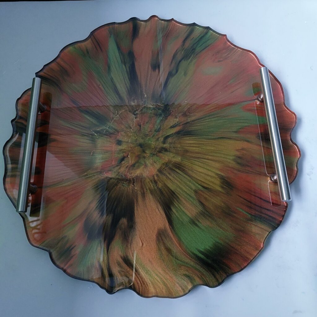 Dit prachtige zware dienblad is gemaakt van epoxy hars in combinatie met mica poeder. Doorsnede: 32 cm Hoogte: 1 cm...
