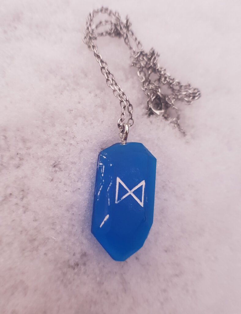 De rune is gemaakt van epoxy hars, acryl verf en gecoat voor bescherming. De ketting is van roest vrij staal.