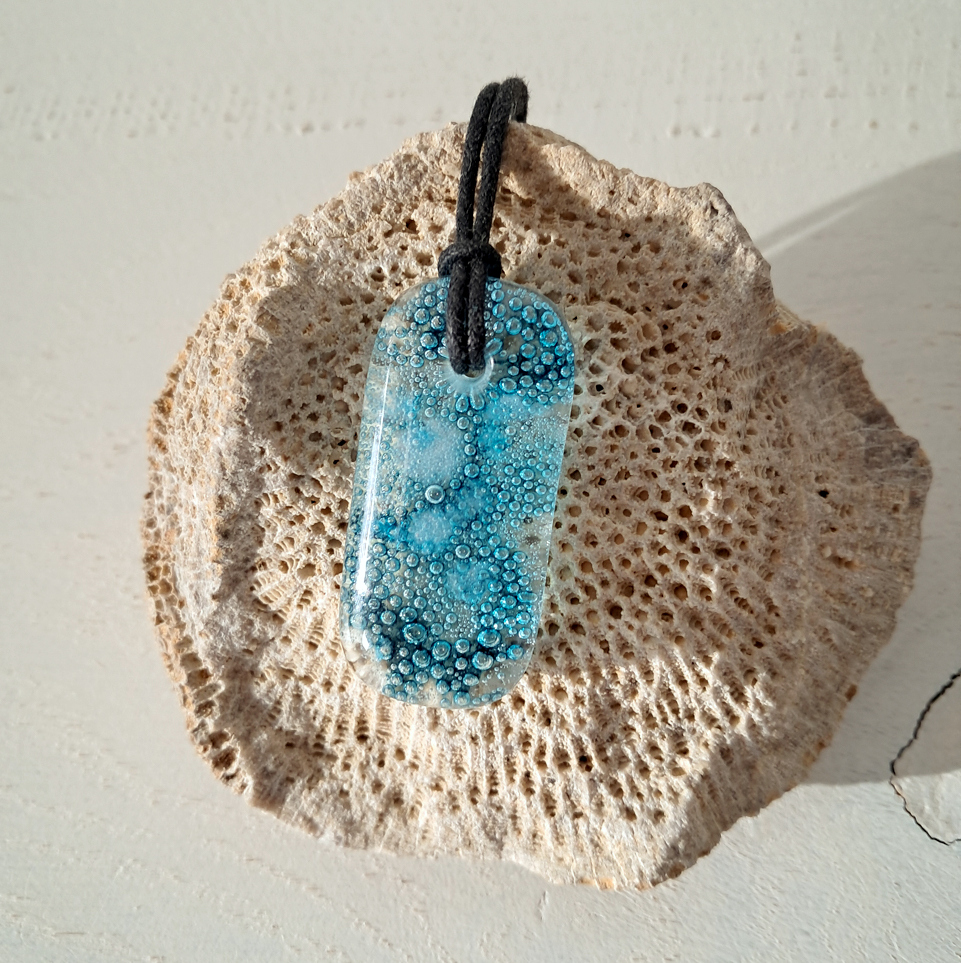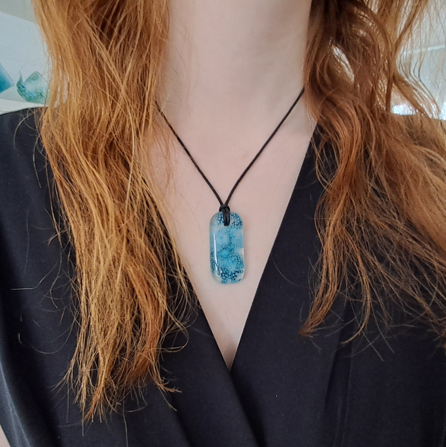Met de hand gemaakte meerdere keren versmolten hanger. Formaat van de hanger is vier cm hoog en twee cm breed. De ketting is verstelbaar. Omdat de hanger met de hand gemaakt is, bestaat er slechts 1 uniek exemplaar van.