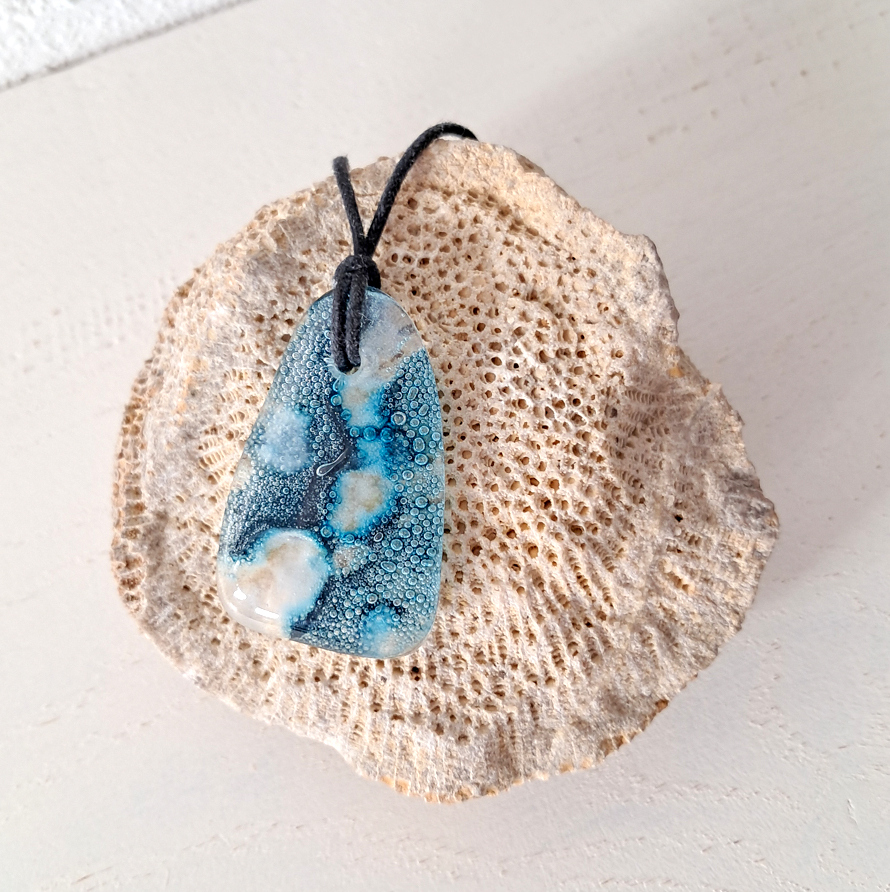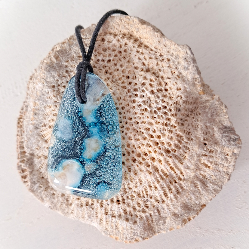 Met de hand gemaakte meerdere keren versmolten hanger. Formaat van de hanger is 4,2 cm hoog, bovenaan 1,3 cm en onderaan 2,7 cm breed. De ketting is verstelbaar. Omdat de hanger met de hand gemaakt is, bestaat er slechts 1 uniek exemplaar van.