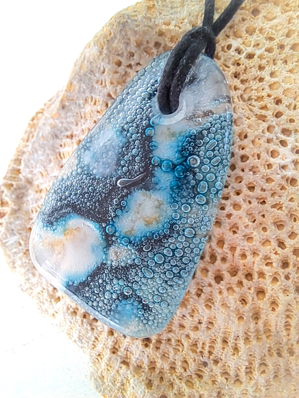 De hanger is niet gelijmd, maar doorboord. Hierna is hij weer opnieuw in de oven gegaan om er voor te zorgen dat het boorgat niet schuurt maar mooi afgerond is.