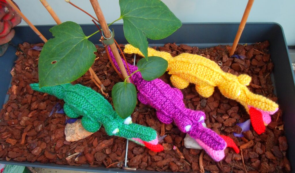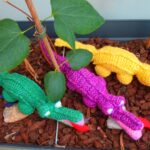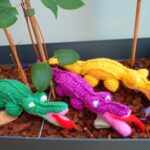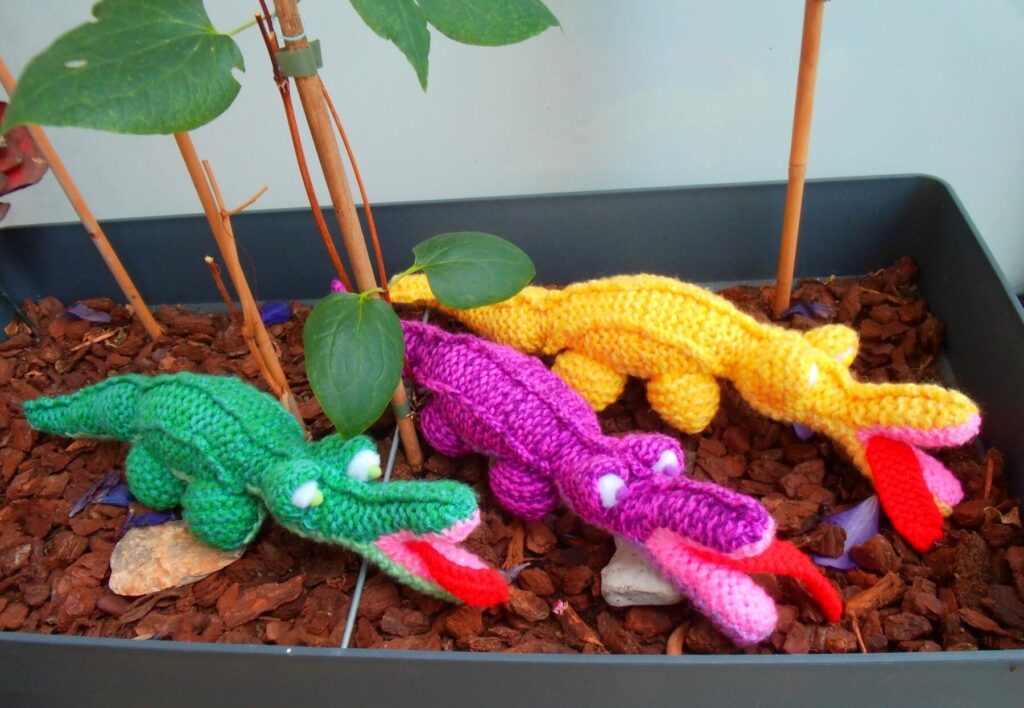 De krokodillen zijn uit het hoofd zonder patroon ontworpen, op de hand gebreid en in elkaar gezet, waardoor elk exemplaar uniek is en geen massaproductie is.