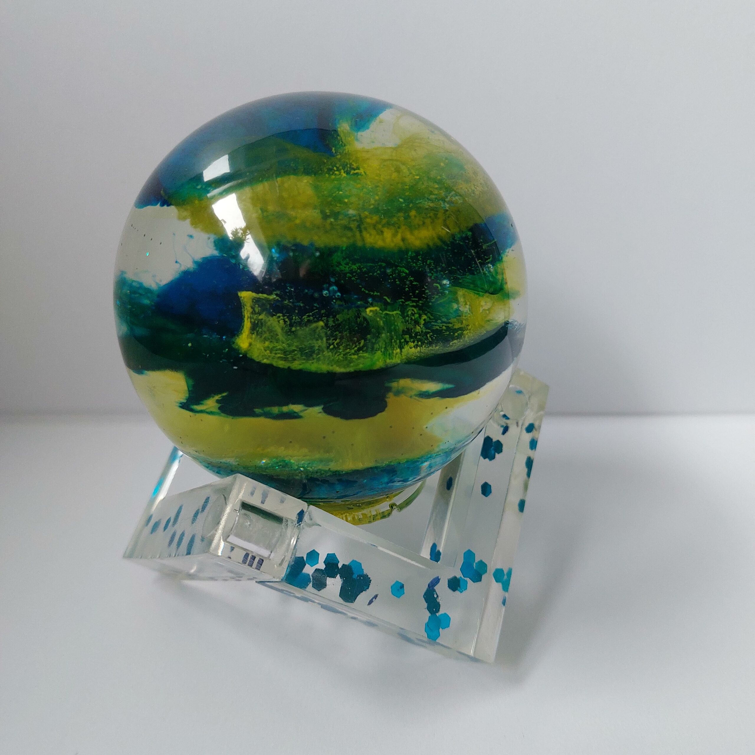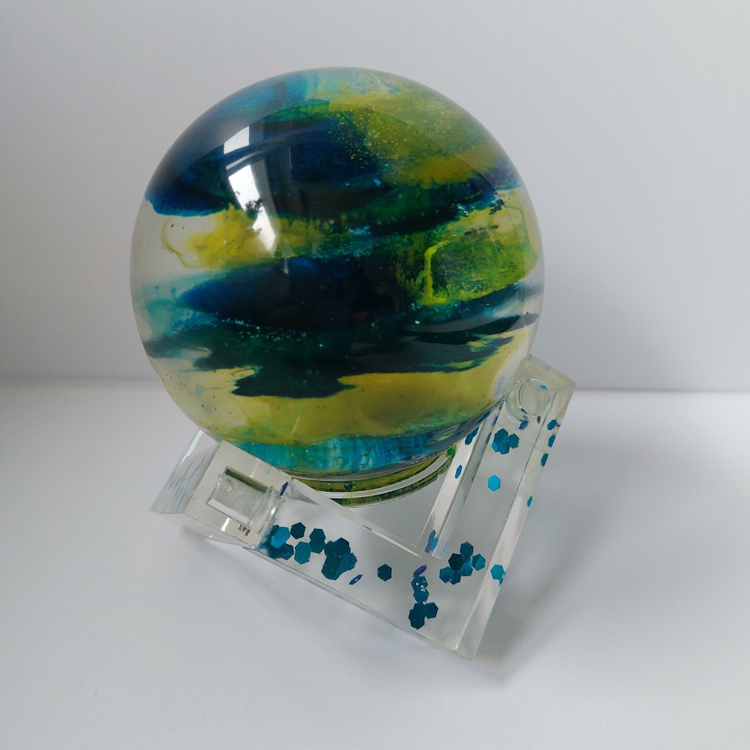 Deze fraaie bol is gemaakt van epoxy hars in combinatie met alcohol inkt en een beetje glitter.