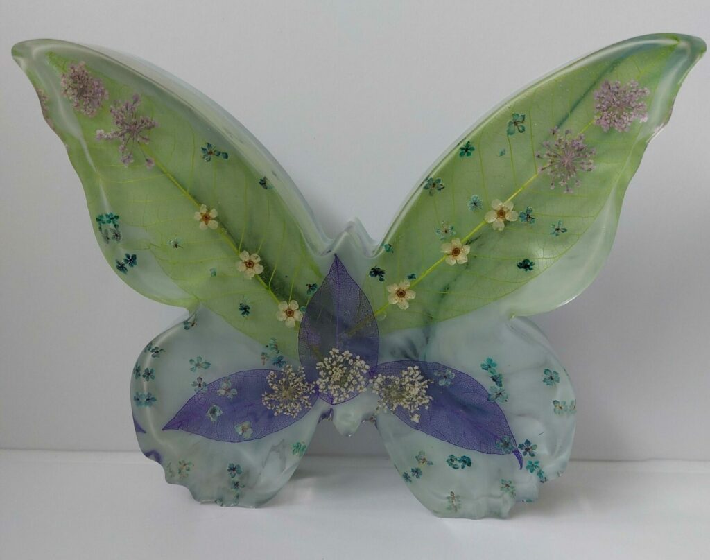 Deze mooie grote vlinder is gemaakt van epoxy hars in combinatie met geperste bloemen en mica poeder.