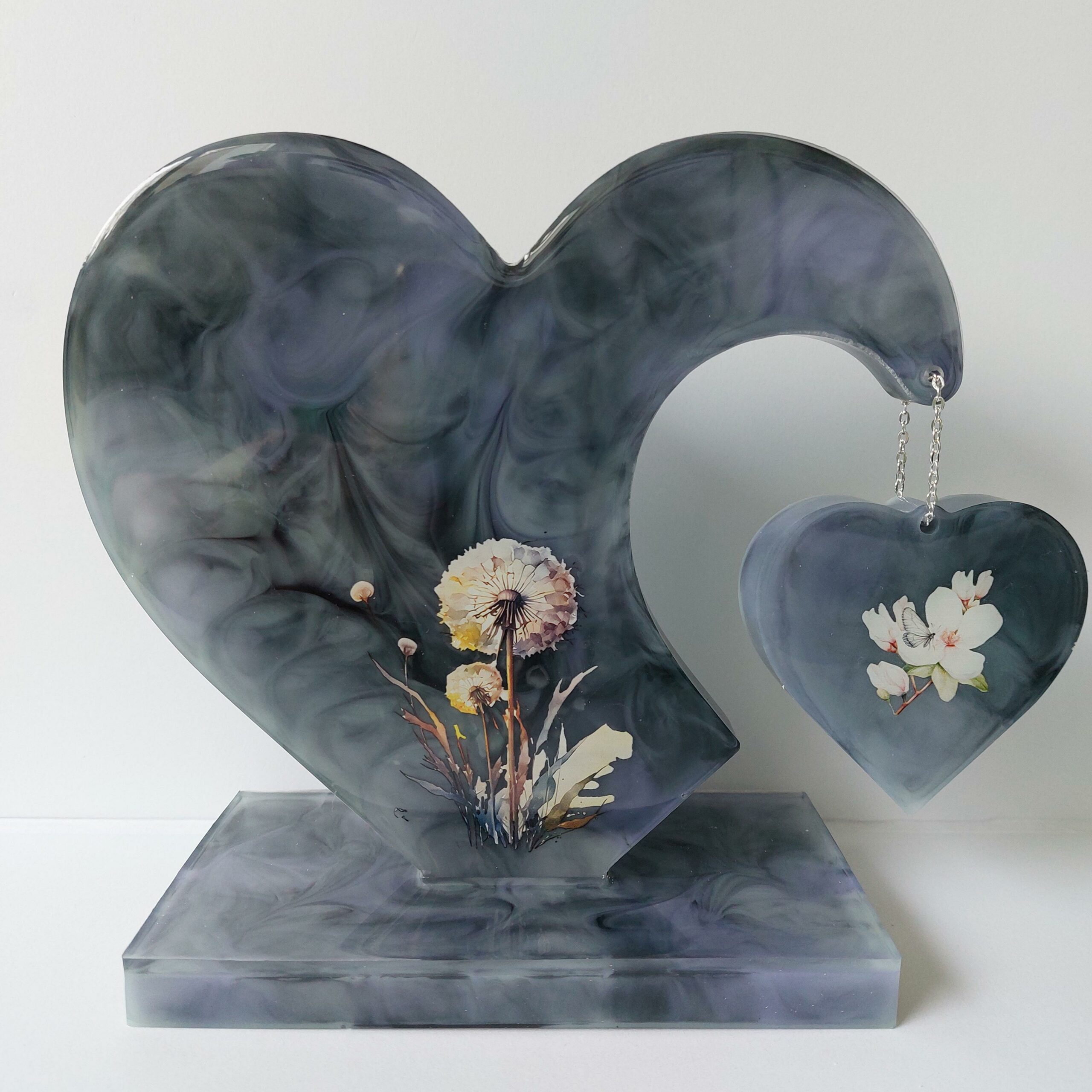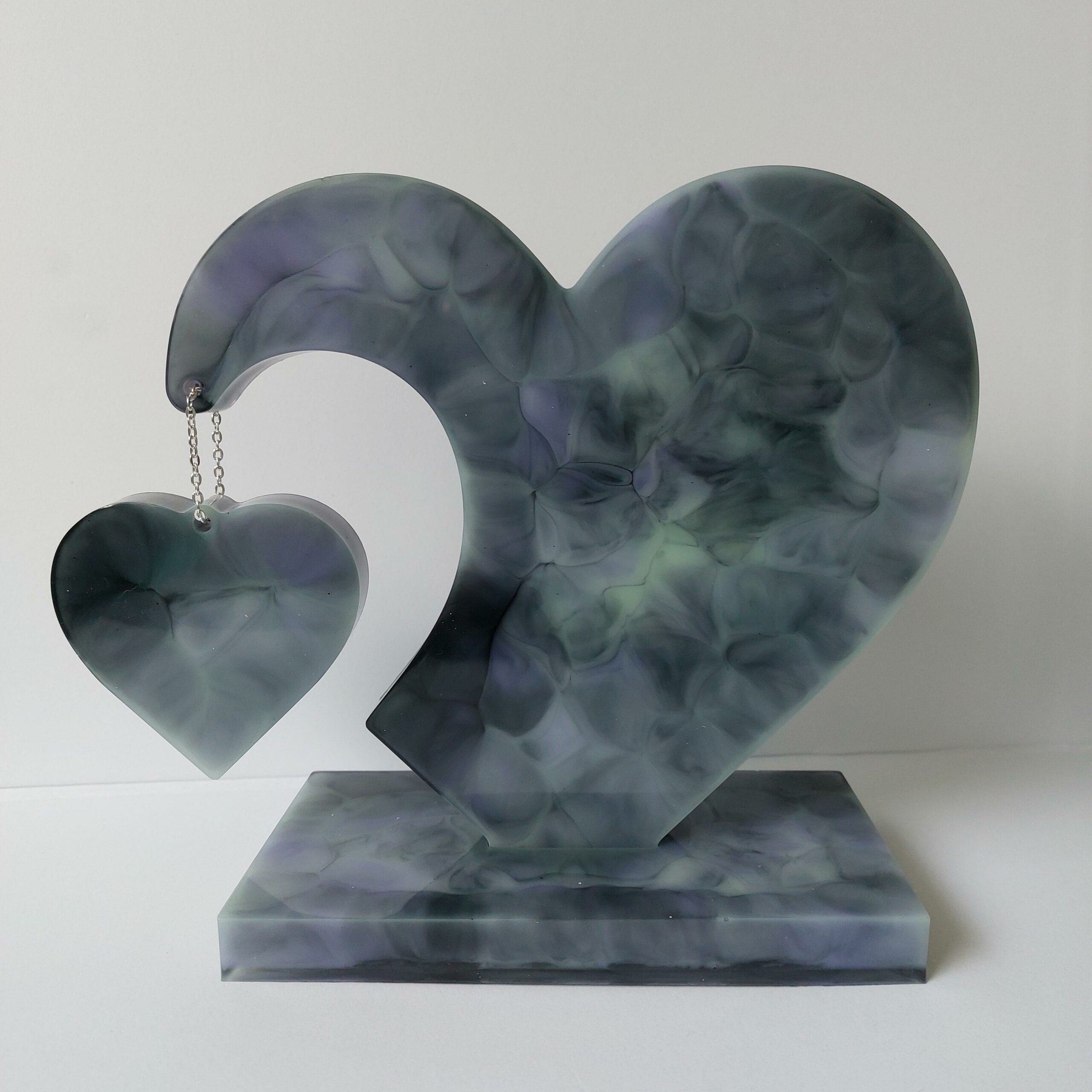 Dit mooie hart is gemaakt van epoxy hars in combinatie met mica poeder en ingegoten stickers.