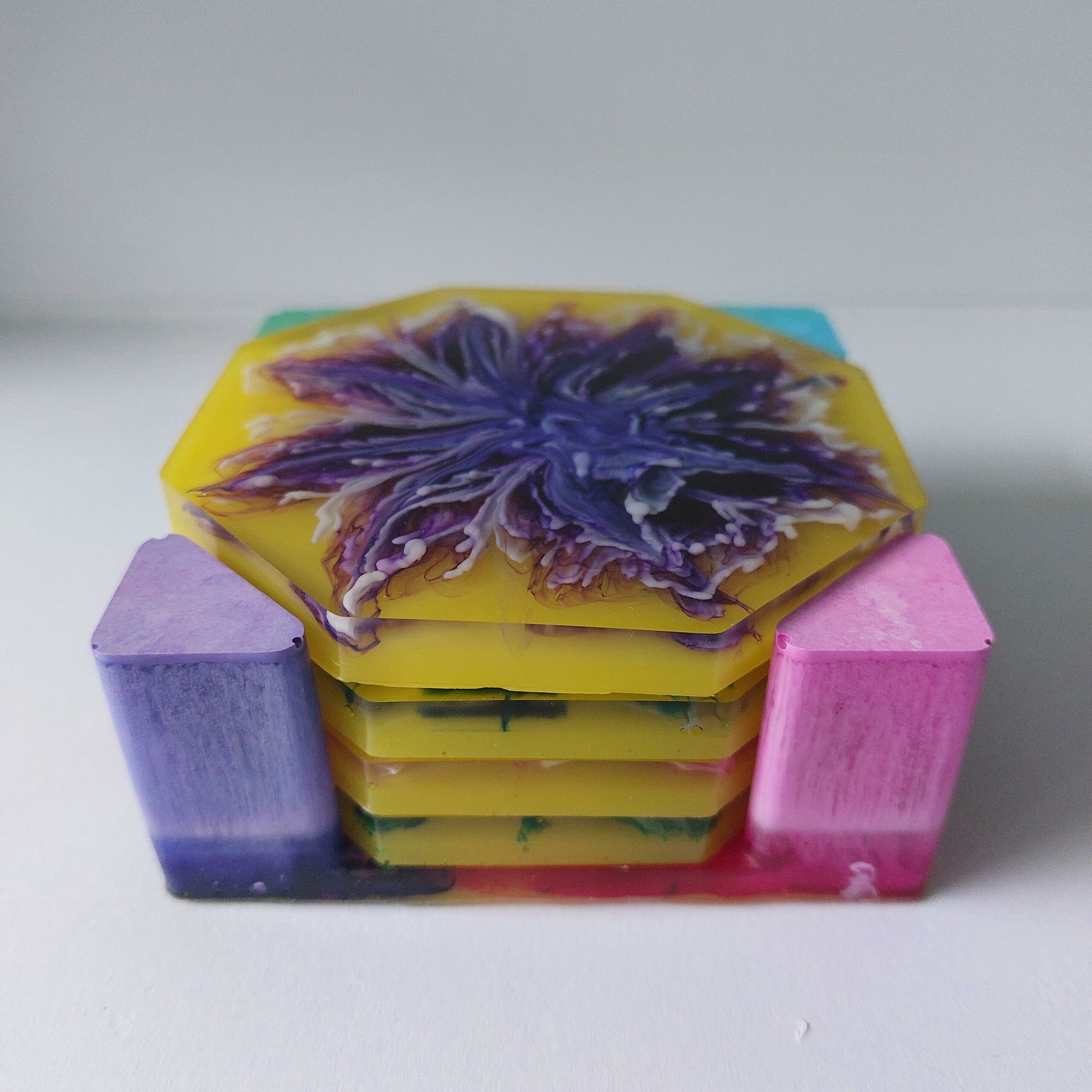 Zeer bijzonder set onderzetters gemaakt van hittebestendige epoxy hars in combinatie met mica poeder en alcohol inkt.