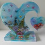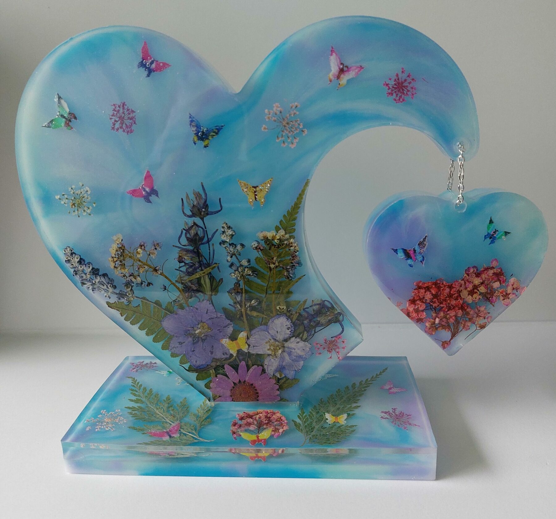 Dit mooie hart is gemaakt van epoxy hars in combinatie met echte droogbloemen en kunststof vlindertjes.
