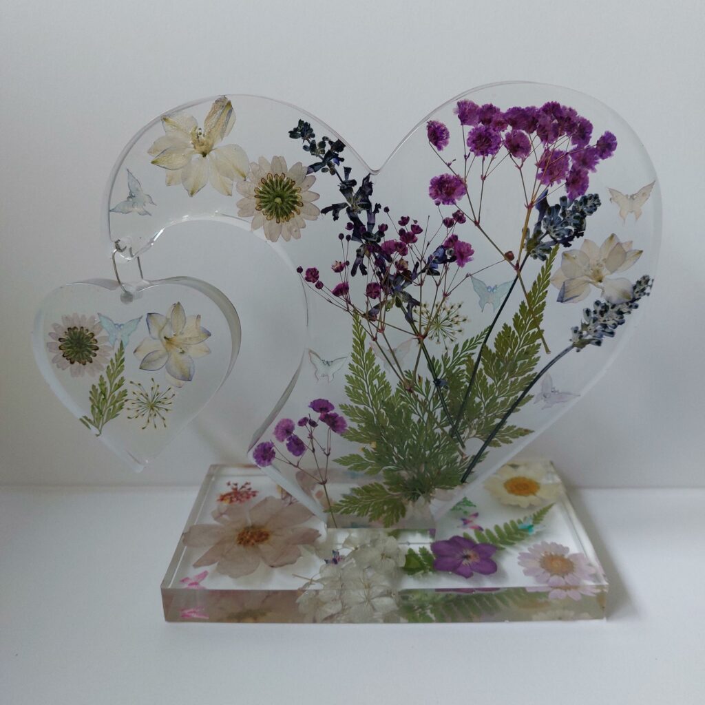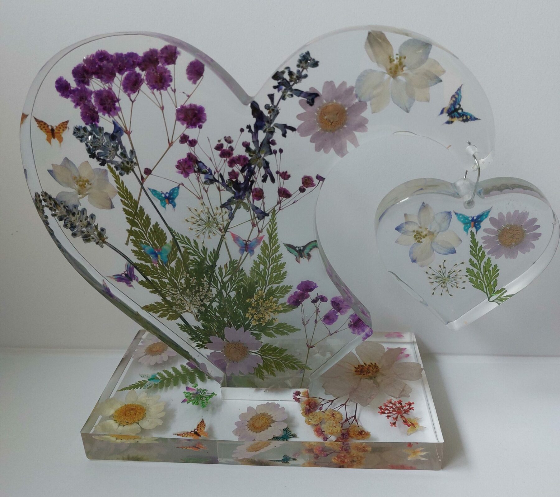 Dit mooie hart is gemaakt van epoxy hars in combinatie met echte geperste bloemen.