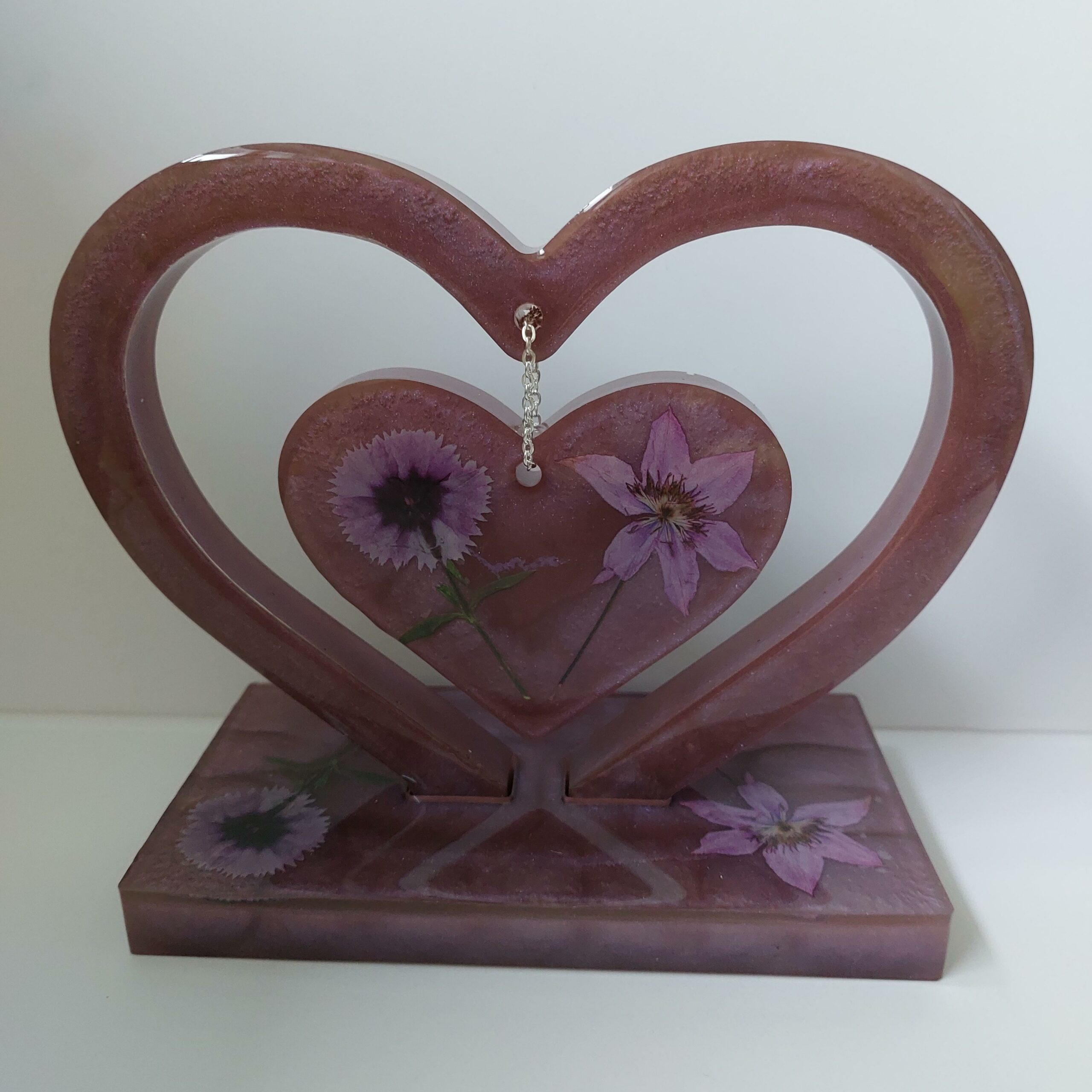 Deze fraaie verschijning is gemaakt van epoxy hars in combinatie met mica poeder en bloemenstickers.
