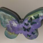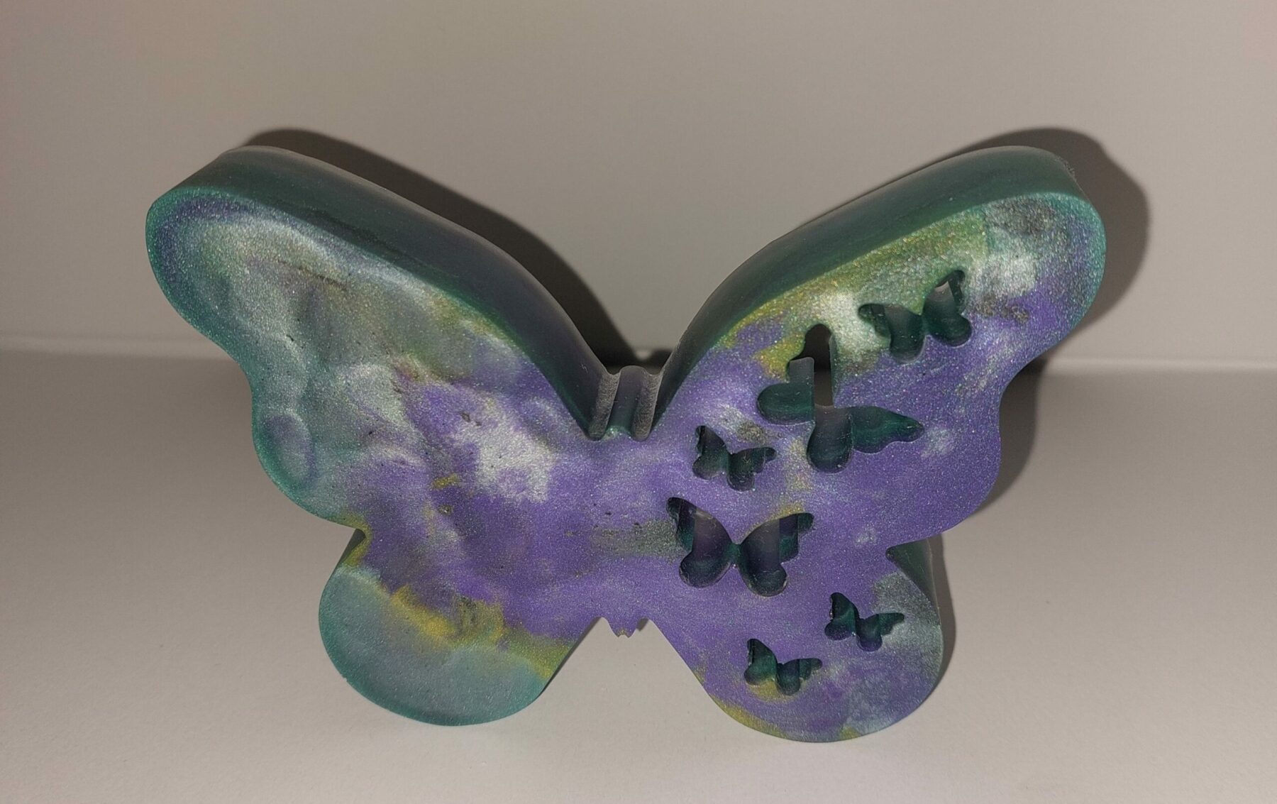Deze mooie vlinder is gemaakt van epoxy hars met mica poeder. Door de open vlindertjes zie je de kleur van de onderlaag.