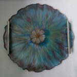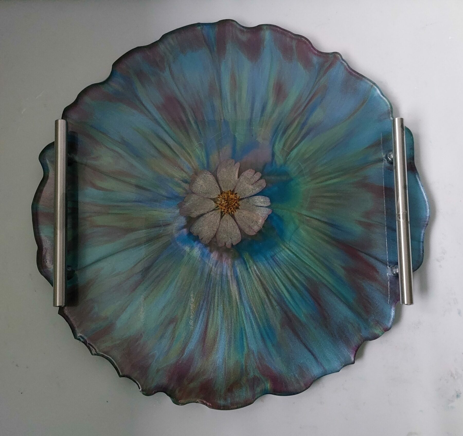 Dit prachtige zware dienblad is gemaakt van epoxy hars in combinatie met mica poeder en een geperste droogbloem.