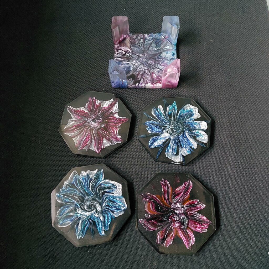 Zeer bijzonder set onderzetters gemaakt van epoxy hars in combinatie met alcohol inkt.