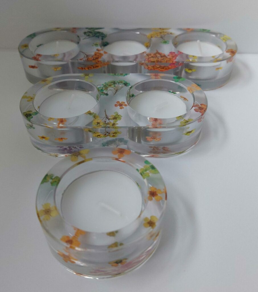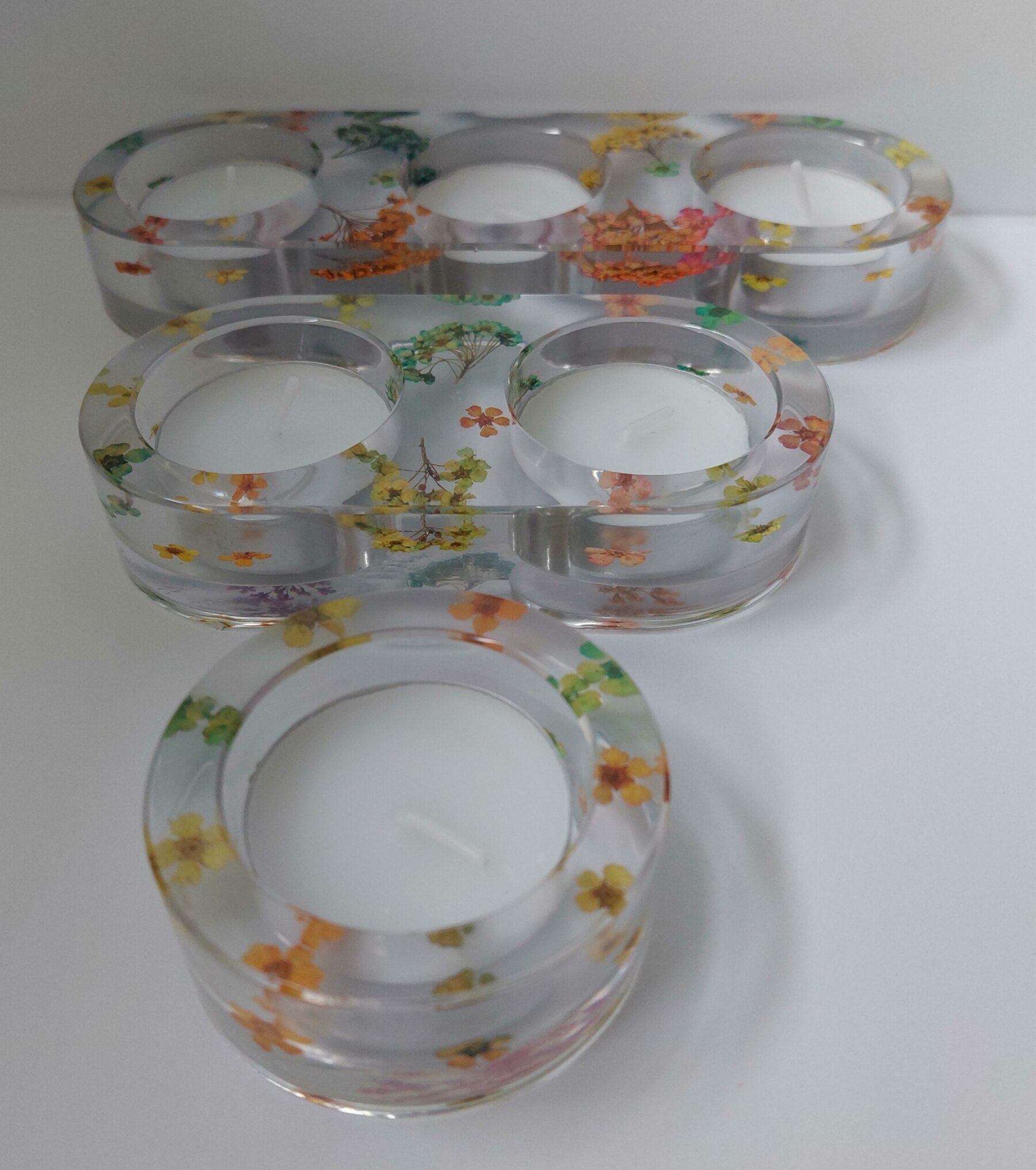 Deze mooie set van waxinelichtjes houders is gemaakt van heldere epoxy hars in combinatie met gedroogde en geperste bloemen.