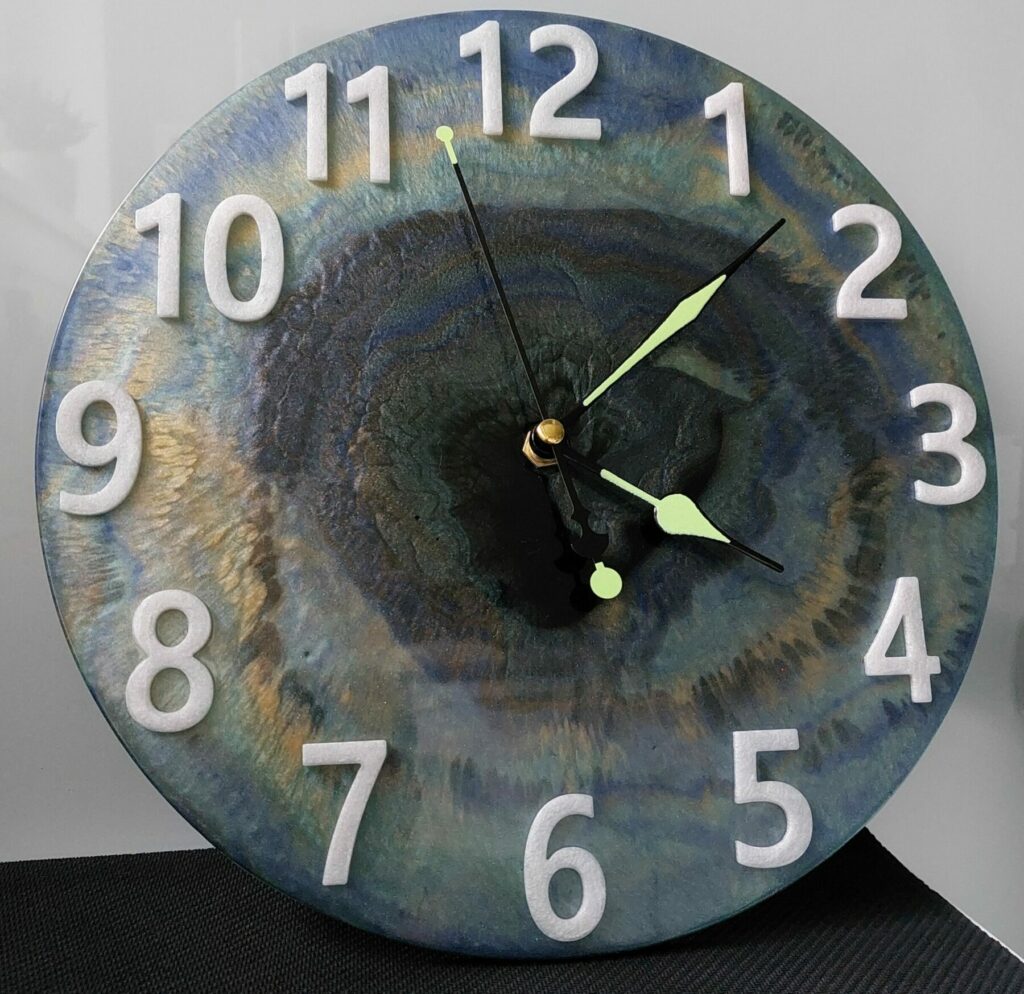 Handgemaakte klok van epoxy hars, doorsnede 25 cm.