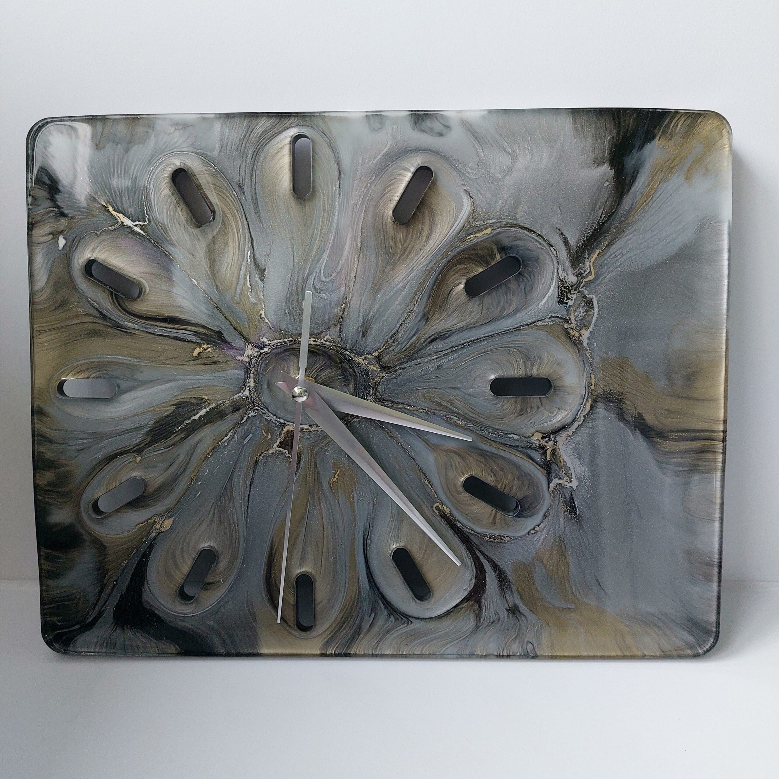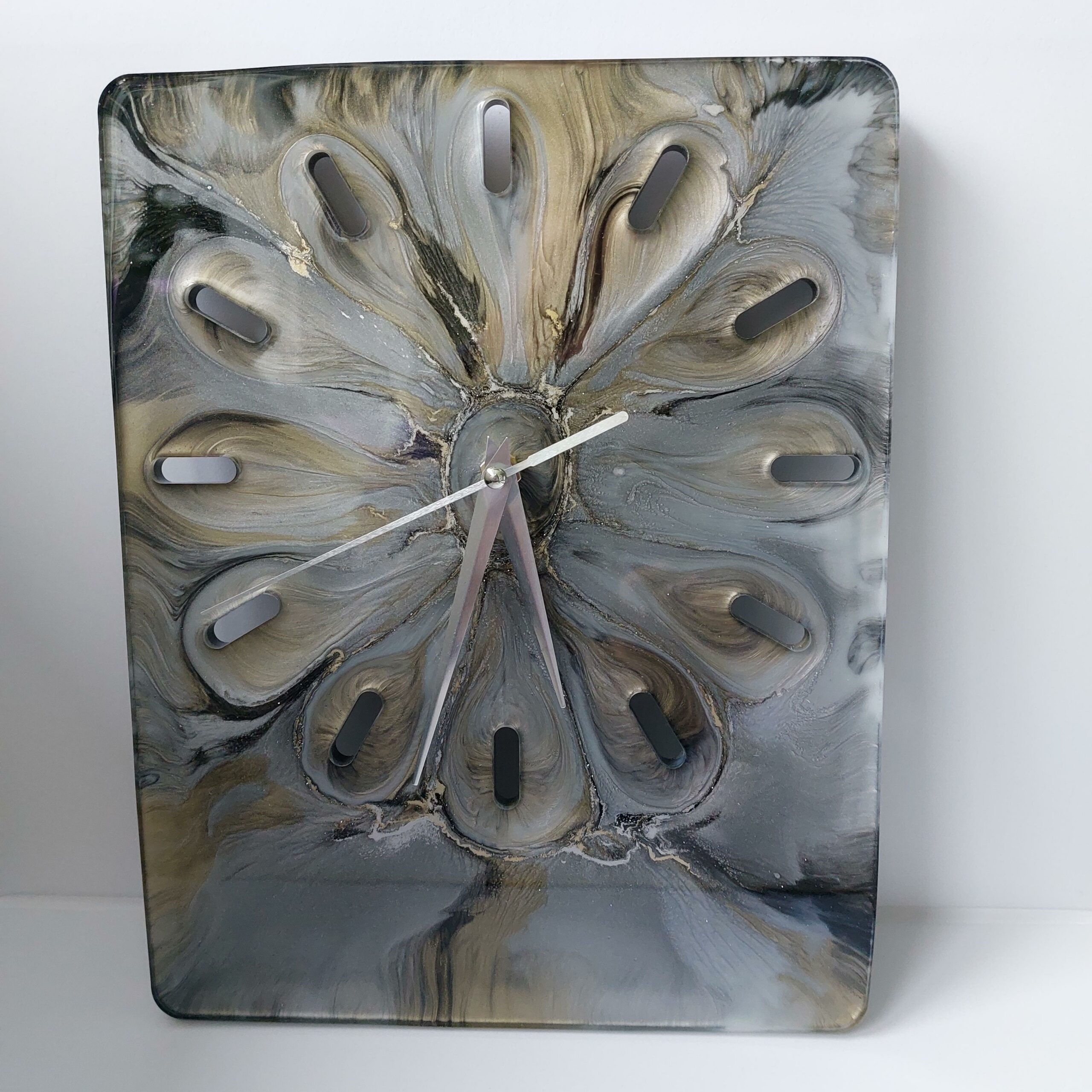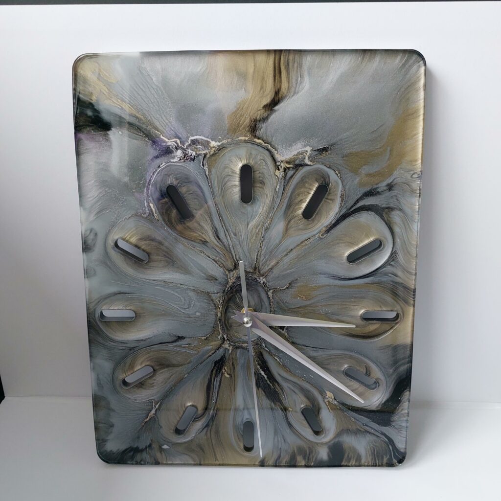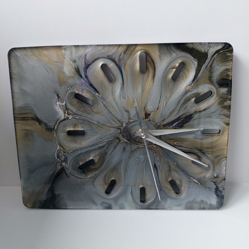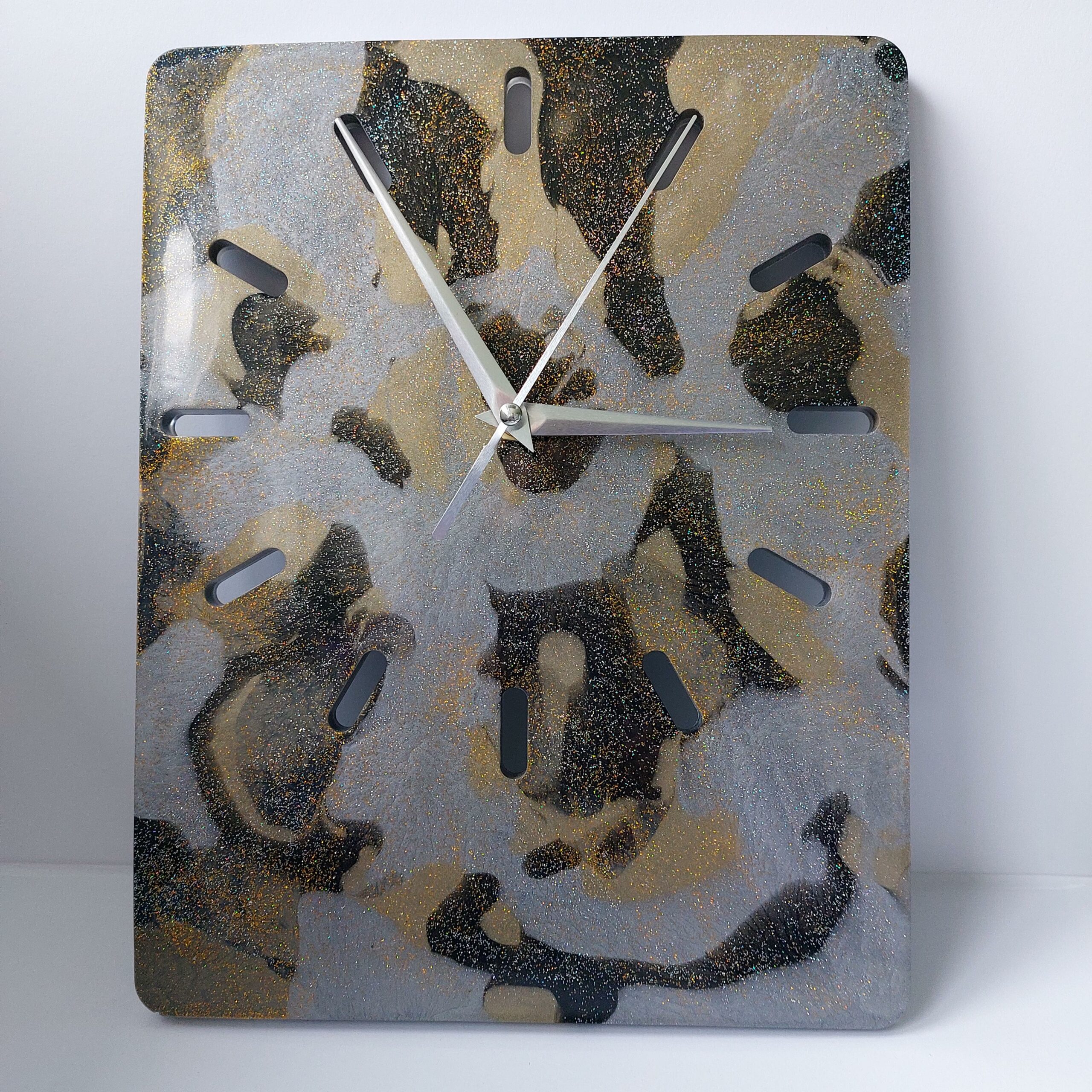 Deze bijzondere klok is gemaakt van epoxy hars in combinatie met mica poeder.