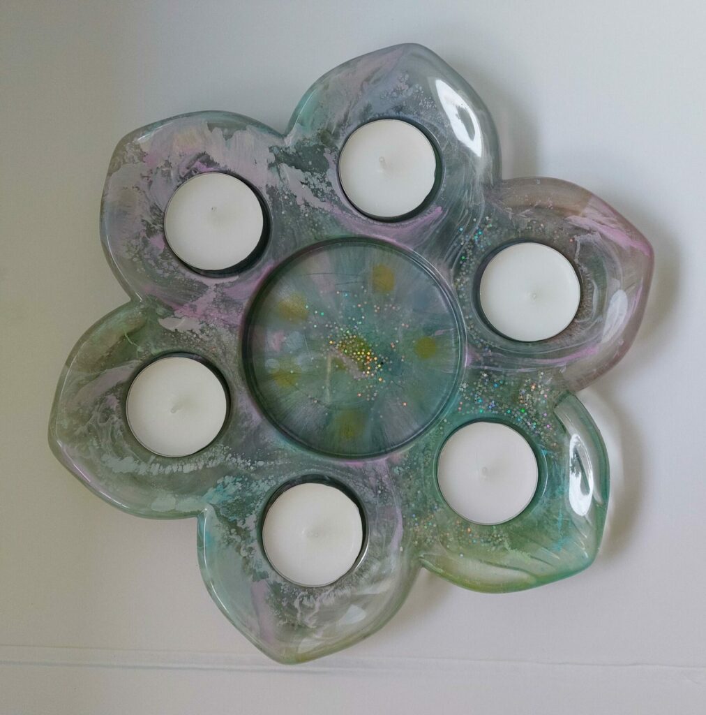 Deze unieke schaal is in de vorm van een bloem en gemaakt van epoxy in combinatie met alcohol inkt.