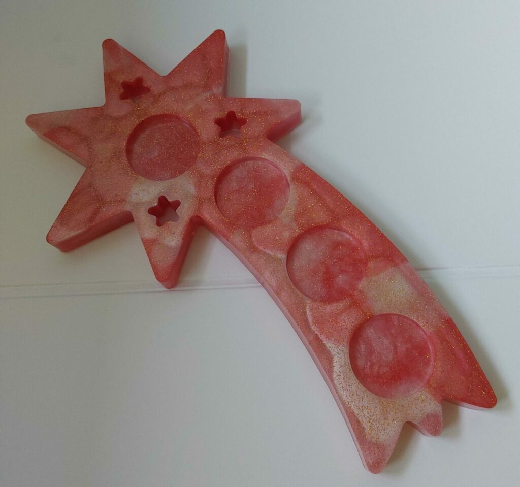 Deze mooie waxinelichtjes houder voor 4 waxinelichtjes is gemaakt van epoxy hars in combinatie met mica poeder en glitter in goudkleur.