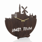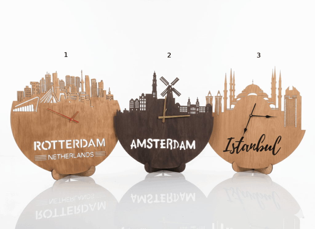 Onze klokken worden met uiterste laserprecisie gesneden uit hoogwaardig hout en vangen de iconische silhouetten van de stad op een gedetailleerde en elegante manier.