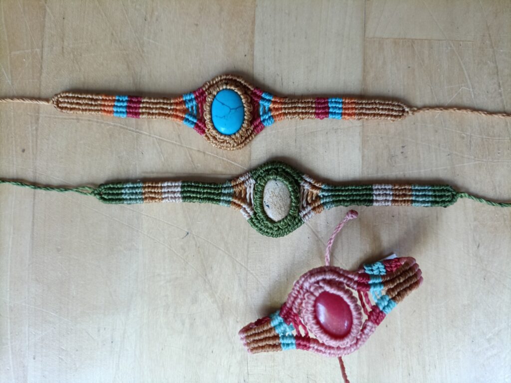 Deze blije armbanden heb ik geknoopt met polyester wax garen van 1 mm en de cabuchons zijn 1.8 bij 1 cm. Het knoopwerk is 14 cm en het breedste gedeelte is 3 cm. Voorzien van een verstelbare sluiting.
