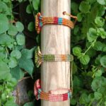 De bovenste armband draagt een turquoise cabochon, die energie en helderheid uitstraalt. De warme aardetint caramel gecombineerd met het turquoise en rood in het patroon symboliseren balans tussen innerlijke vrede en uiterlijke expressie. Perfect voor wie zijn stem wil laten horen met zachte kracht.