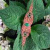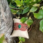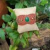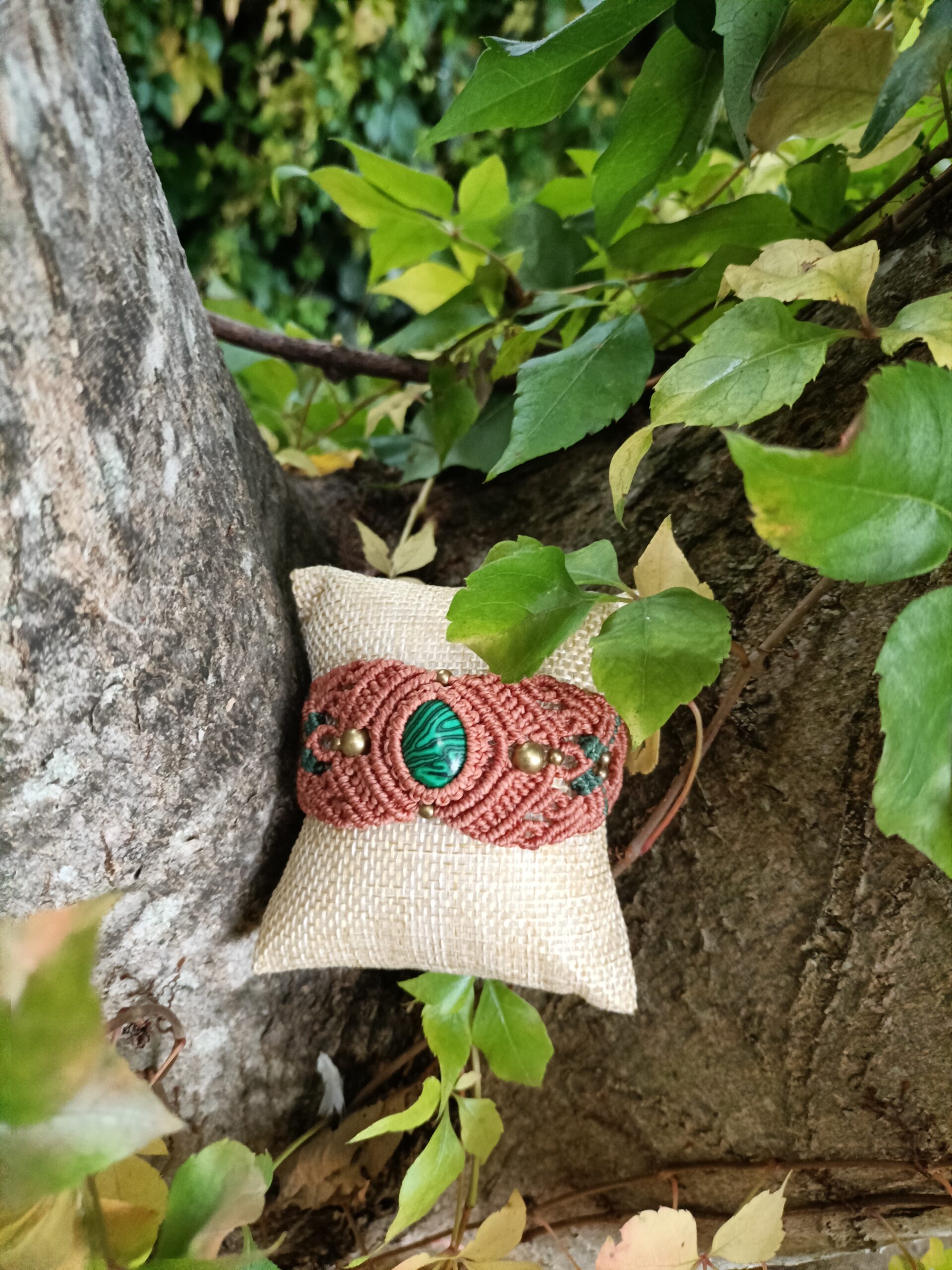 Kaia heb ik geknoopt met polyester waxgaren van 1 mm in de kleur caramel en een beetje dennen groen. De fraaie ovale malachiet cabochon is 1.2 bij 2 cm en ik heb er goudkleurige kraaltjes in verwerkt van 2 en 6 mm. Het knoopgedeelte is 16 cm en het breedste gedeelte is 3.2 cm