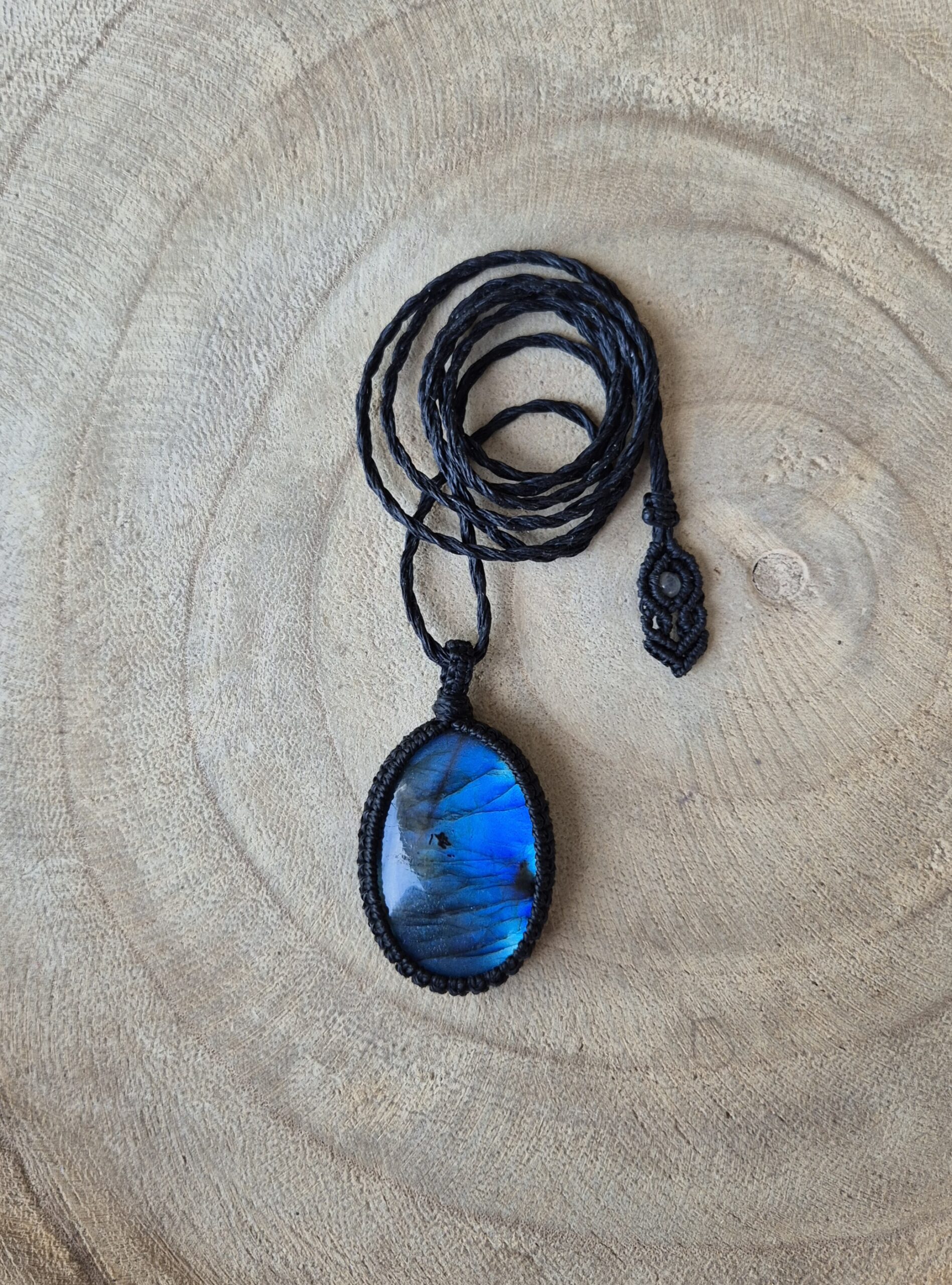 Prachtige blauwe Labradoriet in een zwarte draad geknoopt.
