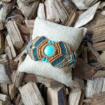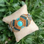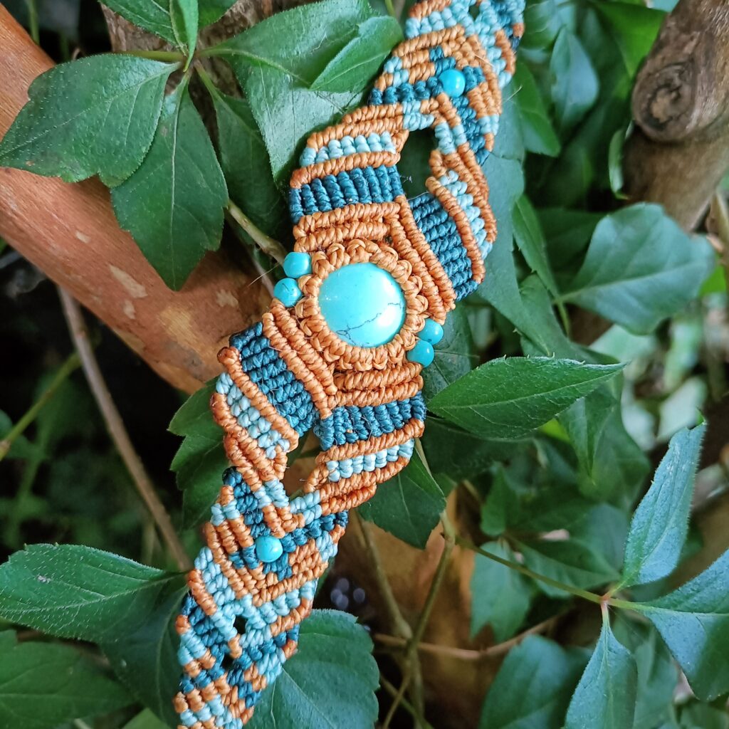 Isy heb ik geknoopt met polyester waxgaren van 1 mm in de kleuren caramel, teal en licht turquoise. Het knoopwerk is 16 cm lang en het breedste gedeelte is 3 cm. De turquoise ronde cabochon is 1.2 cm en ik heb er houten turquoise kraaltjes in verwerkt. De armband heeft een verstelbare sluiting die iedereen past!