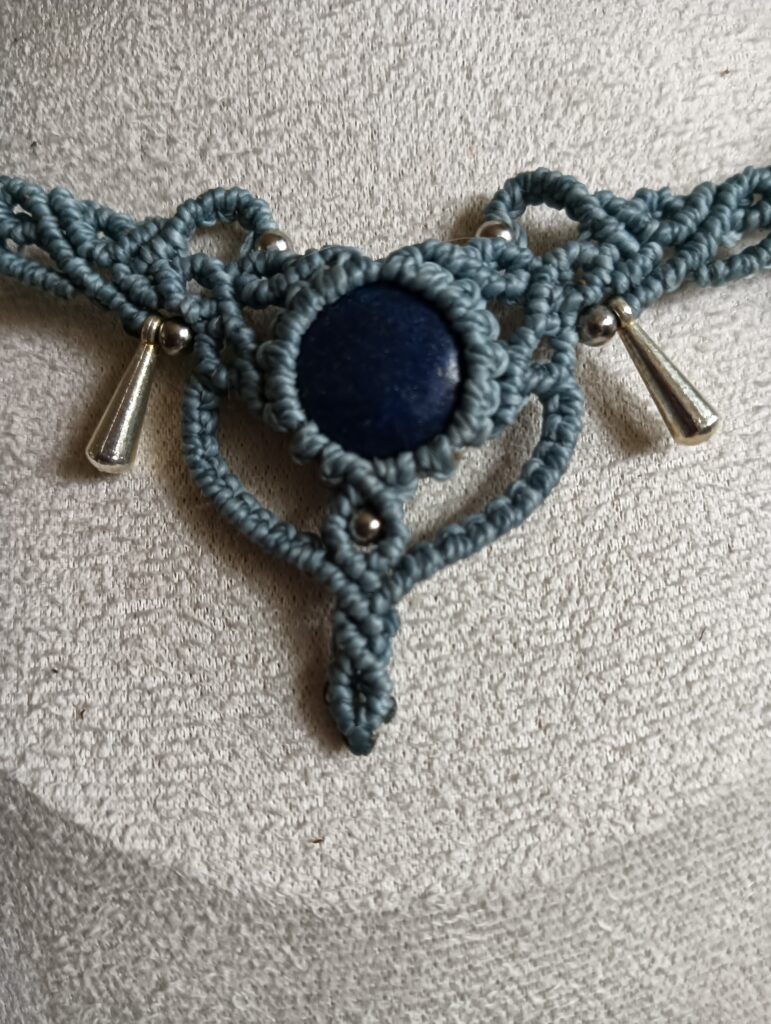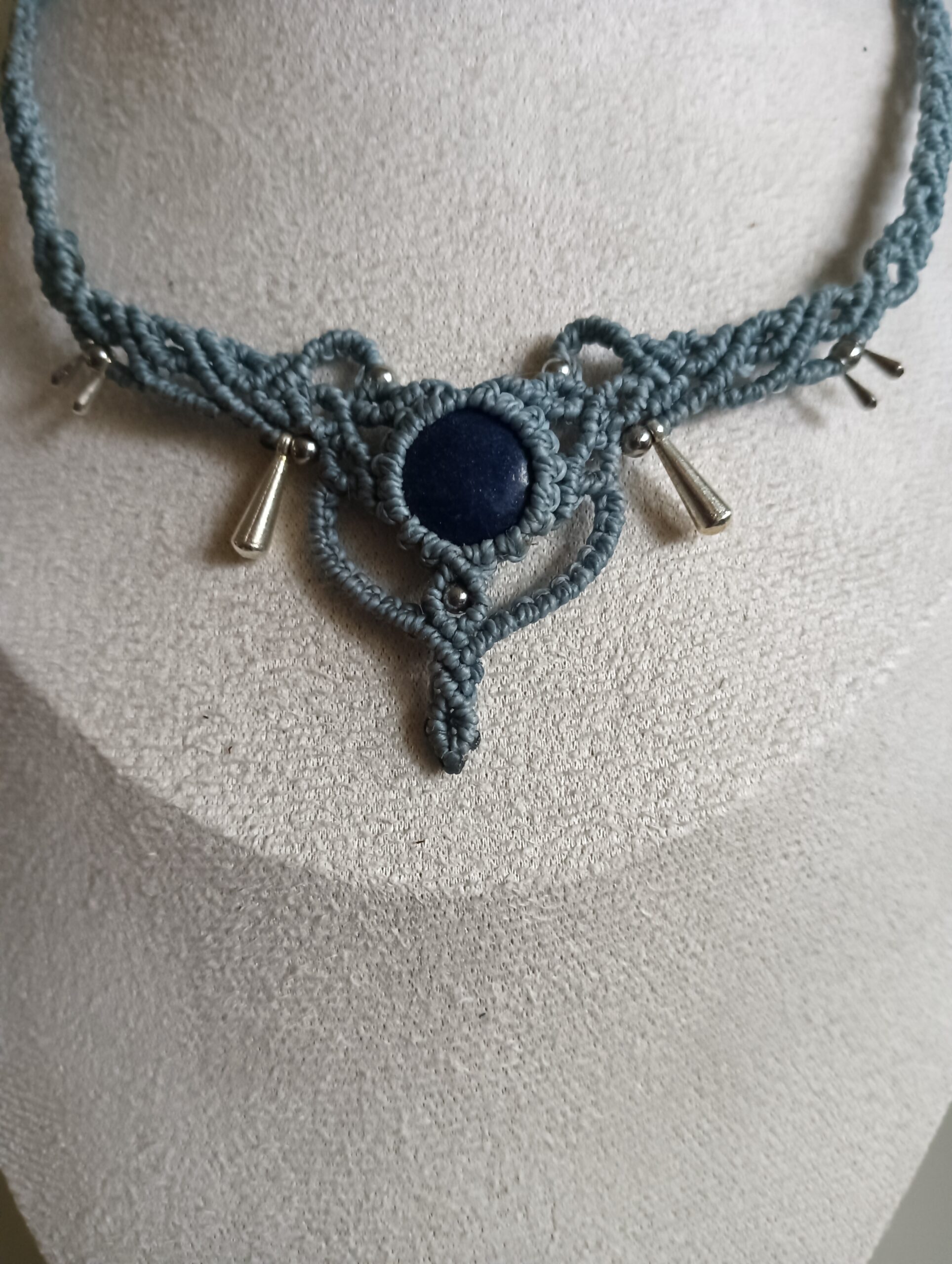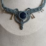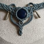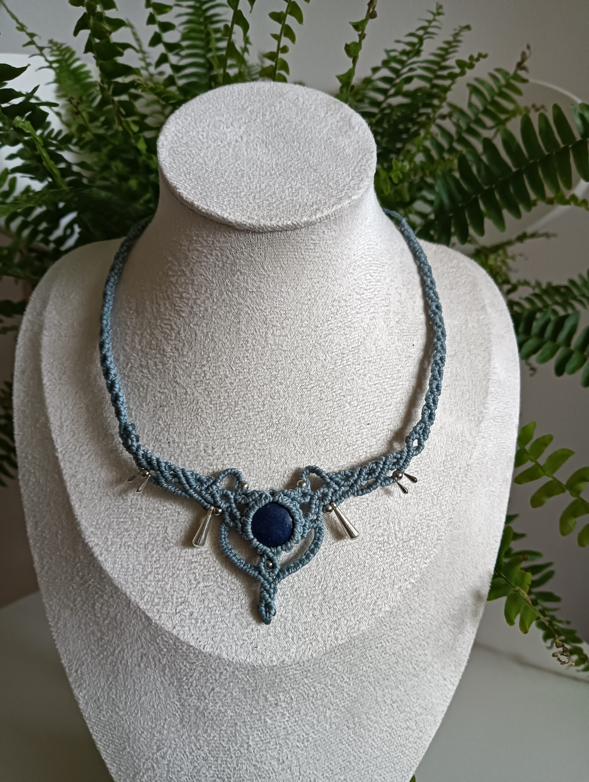 Ketting Izzy is een van die sieraden waar ik meteen een zacht gevoel bij krijg. Ik heb haar geknoopt in een blauwgrijze tint, een kleur die zich ergens mooi nestelt tussen koel en warm, waardoor ze eigenlijk bij alles past. In het midden heb ik een blauw, licht gemêleerd cabochon verwerkt – subtiel glanzend, alsof er een klein beetje nachtelijke schittering in verstopt zit.