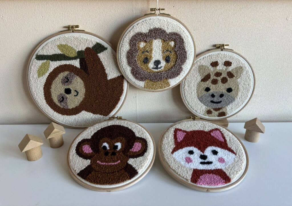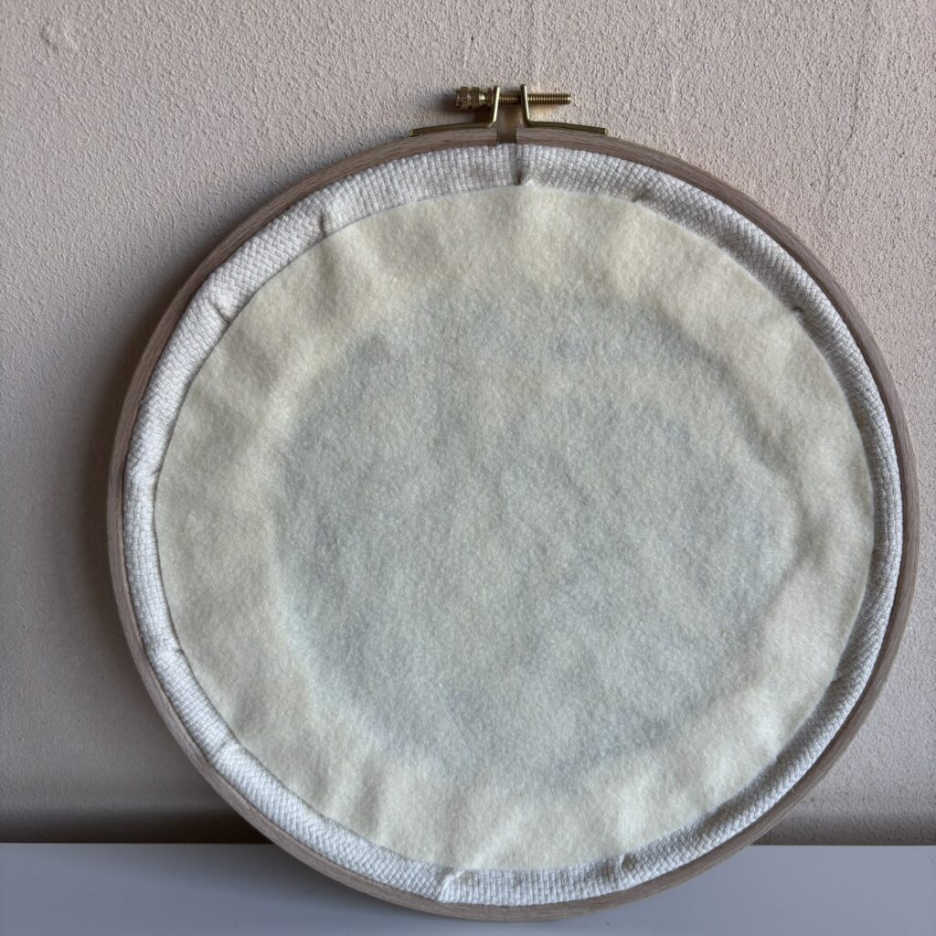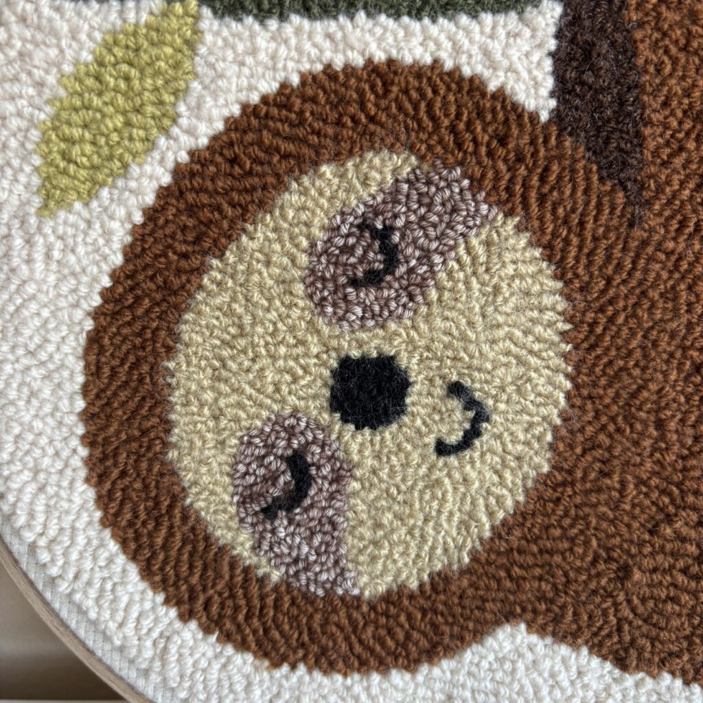 De wanddecoratie is gemaakt met de techniek punch needle en heeft aan de voorkant zachte lusjes van wol. De achterkant is afgewerkt met een lapje vilt.