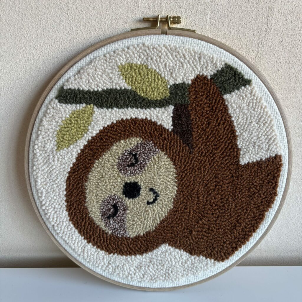 Wanddecoratie in een houten ring met een doorsnede van 26 cm, met de afbeelding van een hangende luiaard.