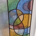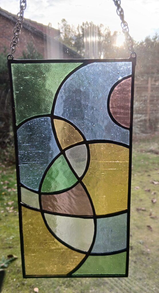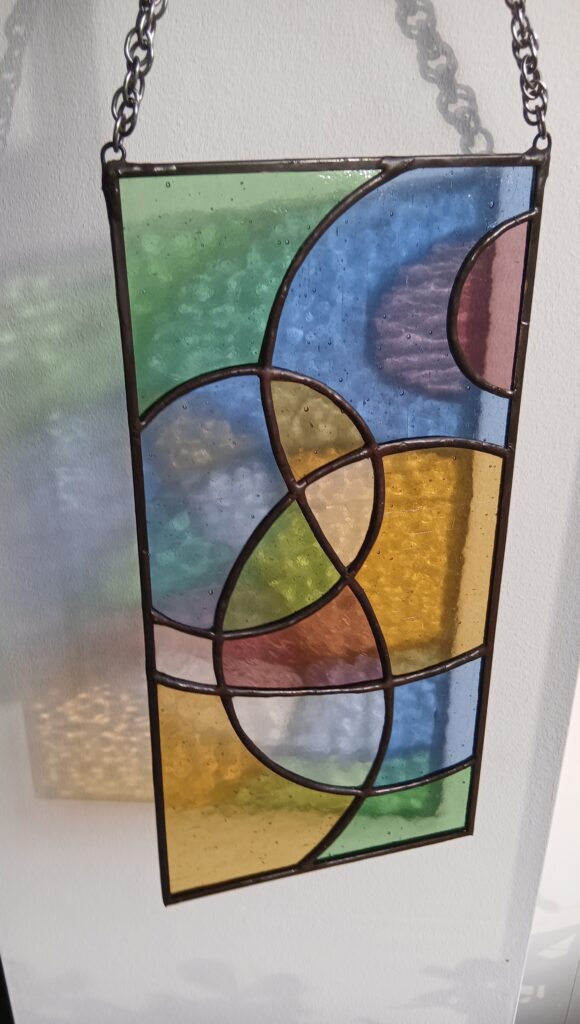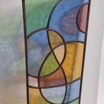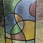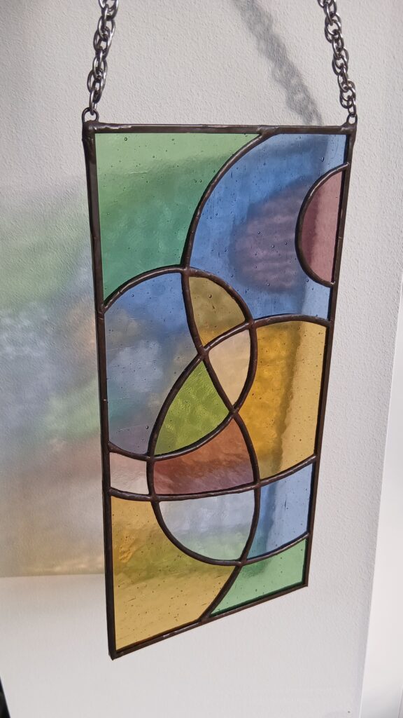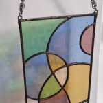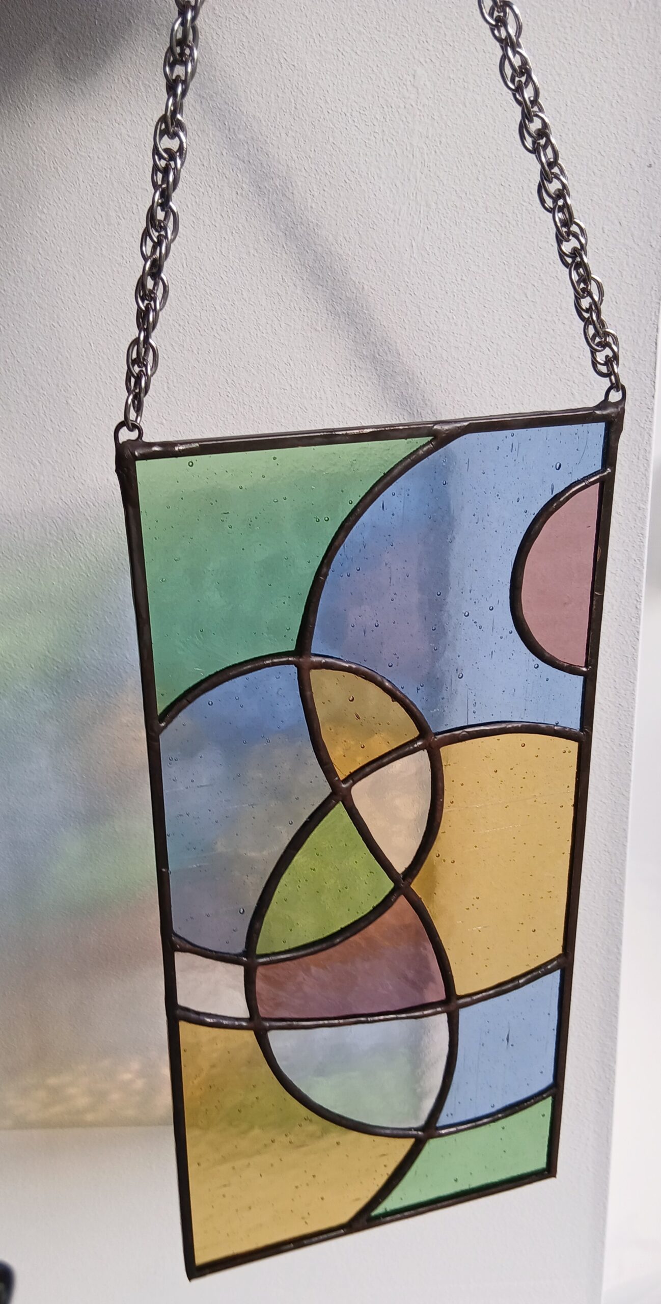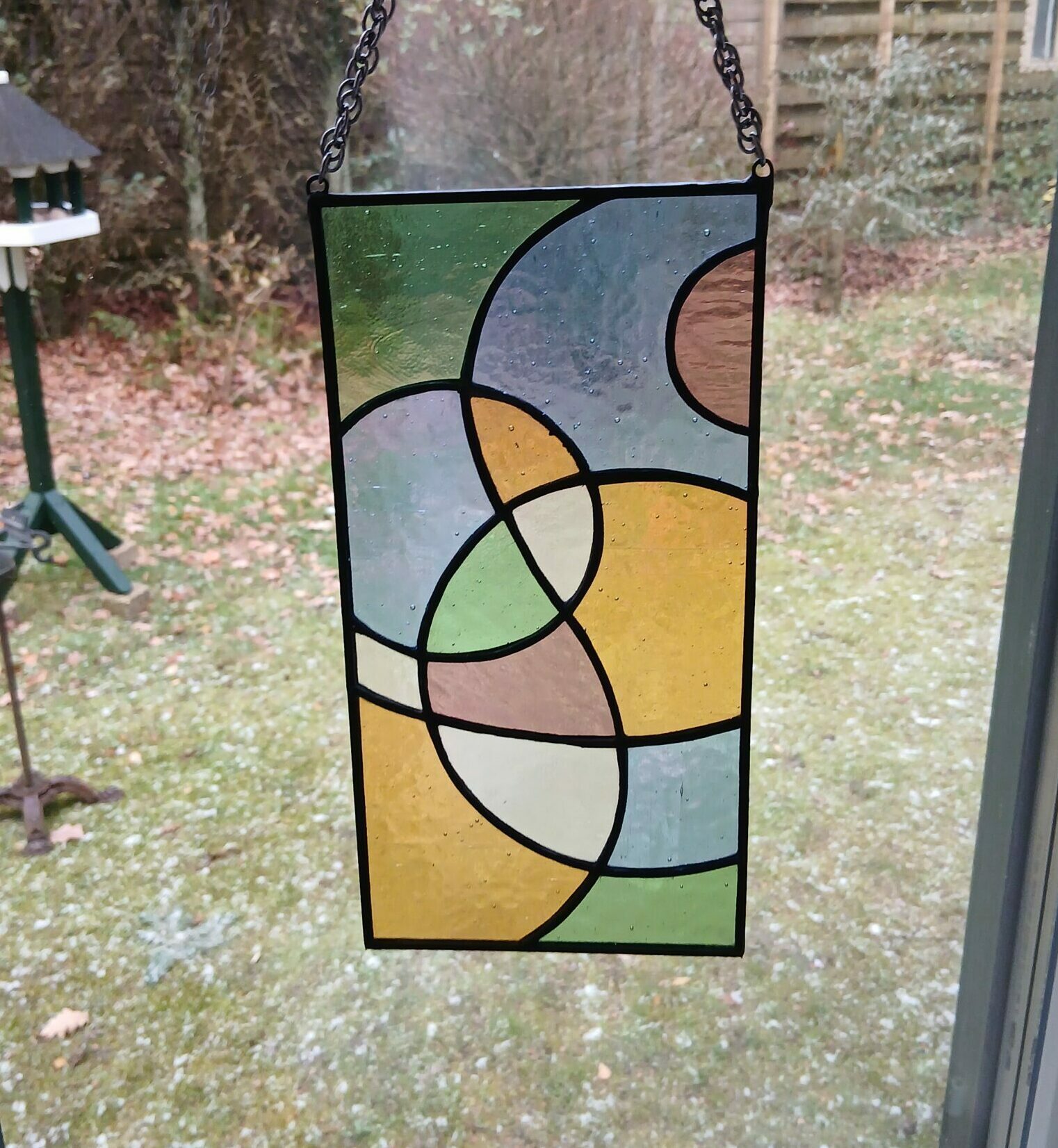 Gemaakt door middel van de tiffany techniek (koperfolie techniek). Het glas heeft een stevige rand van messing eromheen. Echt een aanwinst voor je raam. of op een witte muur. De kleuren geel, blauw, groen en roze schijnen erg mooi door als het licht erop valt.