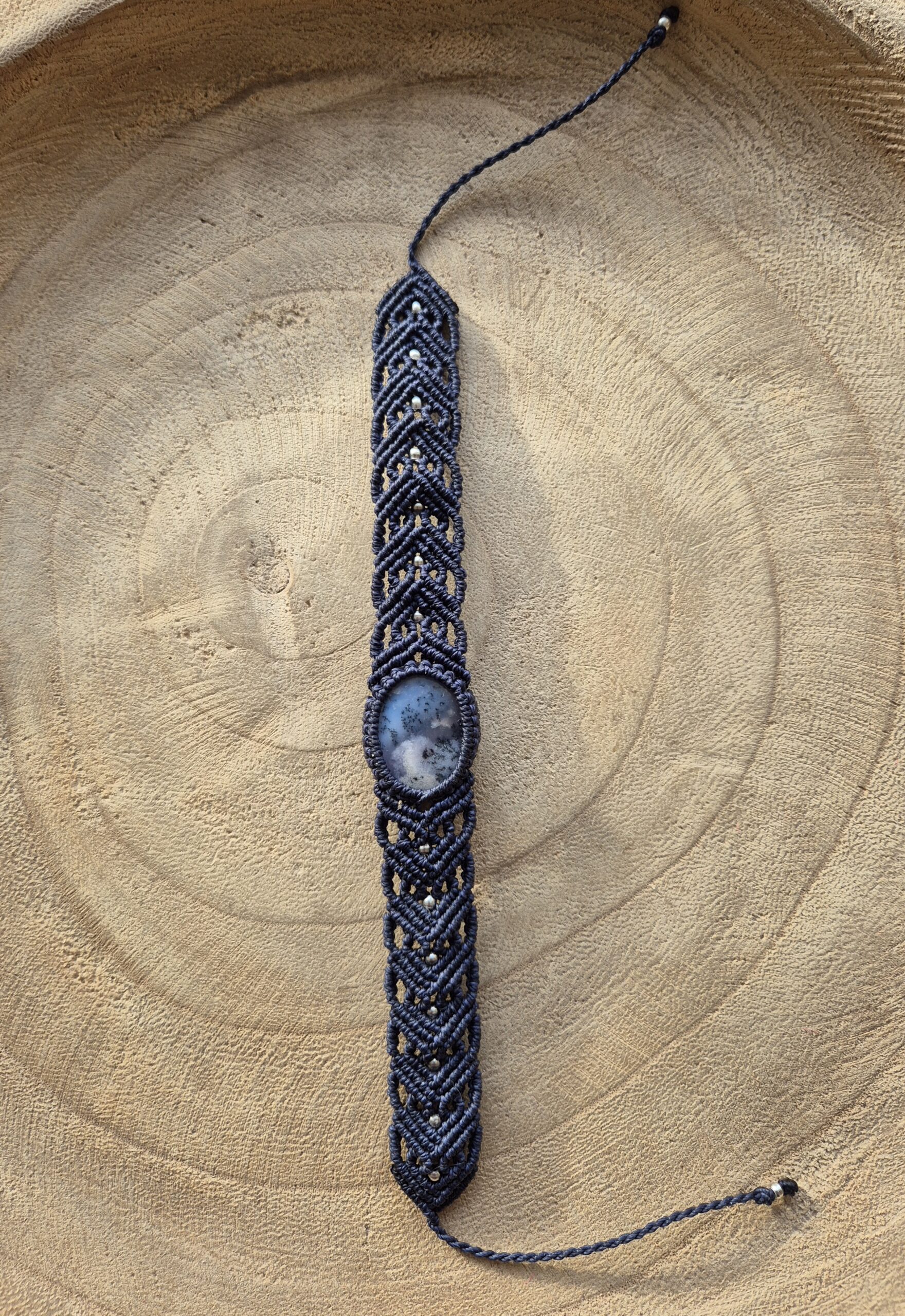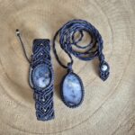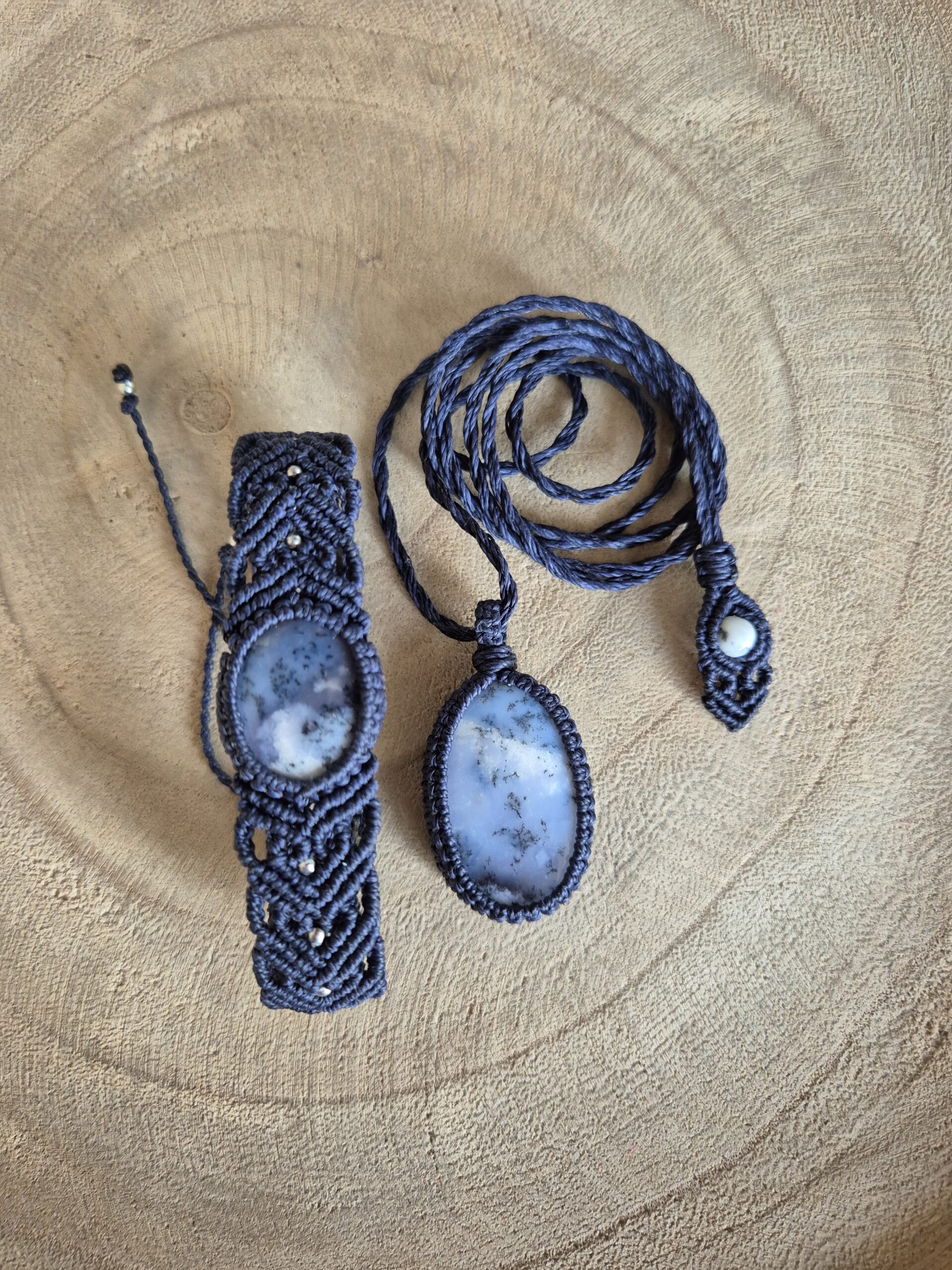 Uniek sieraden set met Dendriet geknoopt in een donker blauwe draad.