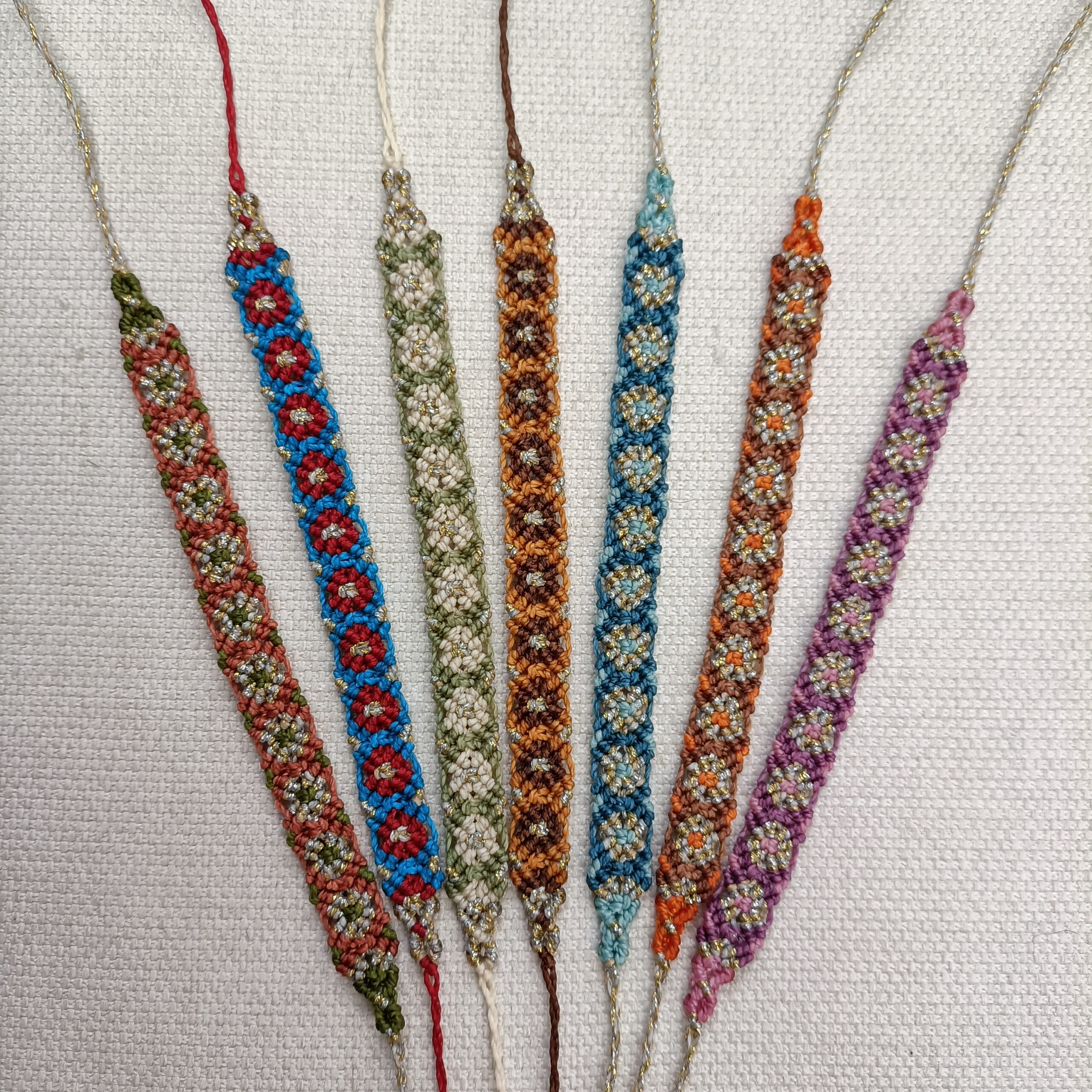Deze blije Bling Bloem armbandjes heb ik geknoopt met 1 mm polyester waxgaren in verschillende kleuren combinaties. Het knoopgedeelte is 14 cm lang en 1.2 cm breed.