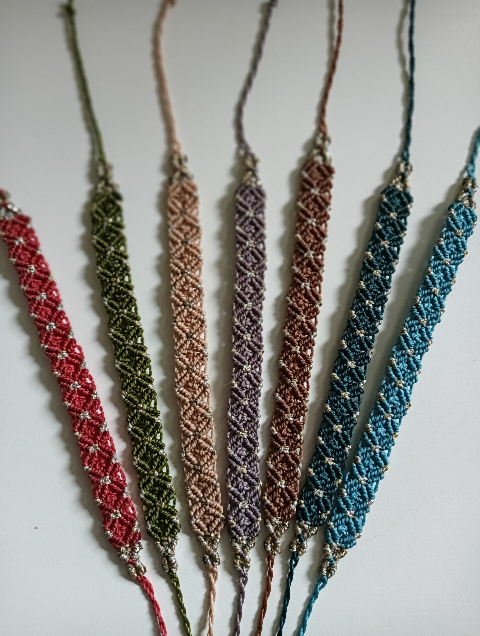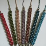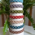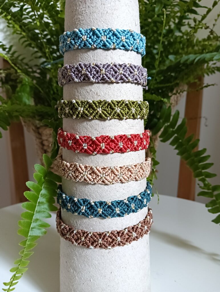 Deze blije Bling Bloem armbandjes heb ik geknoopt met 1 mm polyester waxgaren in verschillende kleuren combinaties. Het knoopgedeelte is 14 cm lang en 1.2 cm breed.