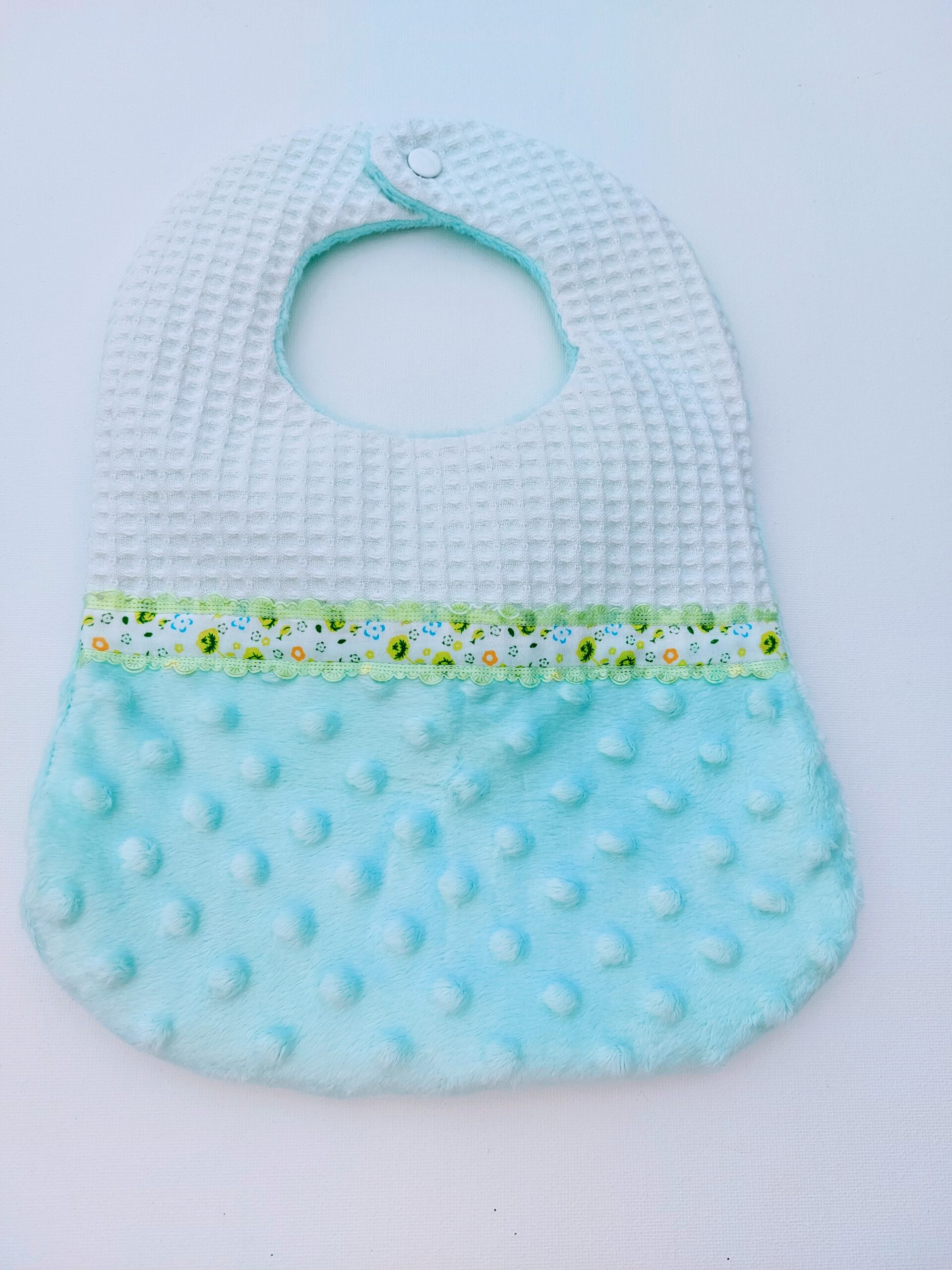 slabbertje gemaakt van nopjes stof en wafelstof afgewerkt met sierbies.