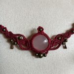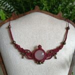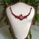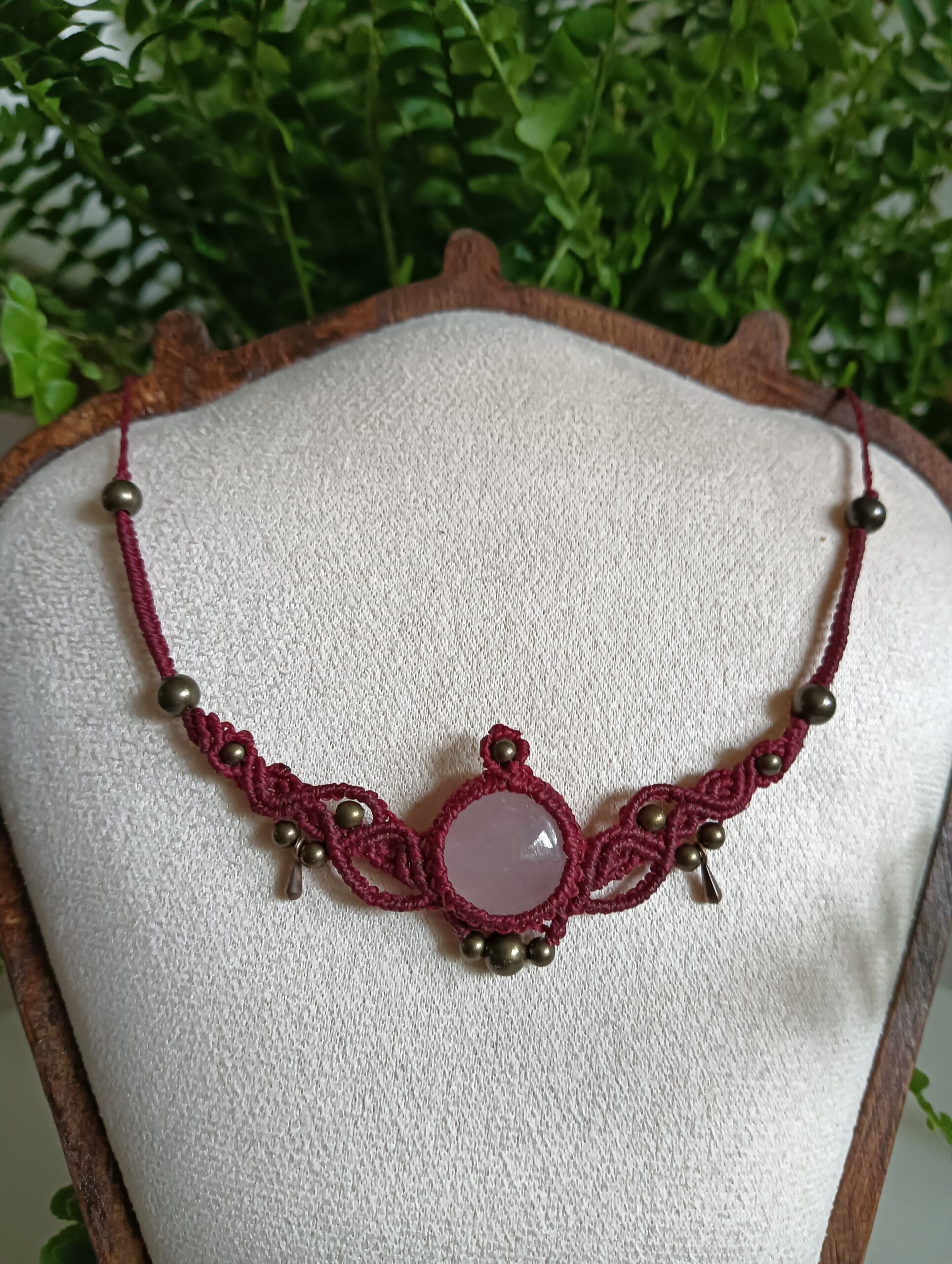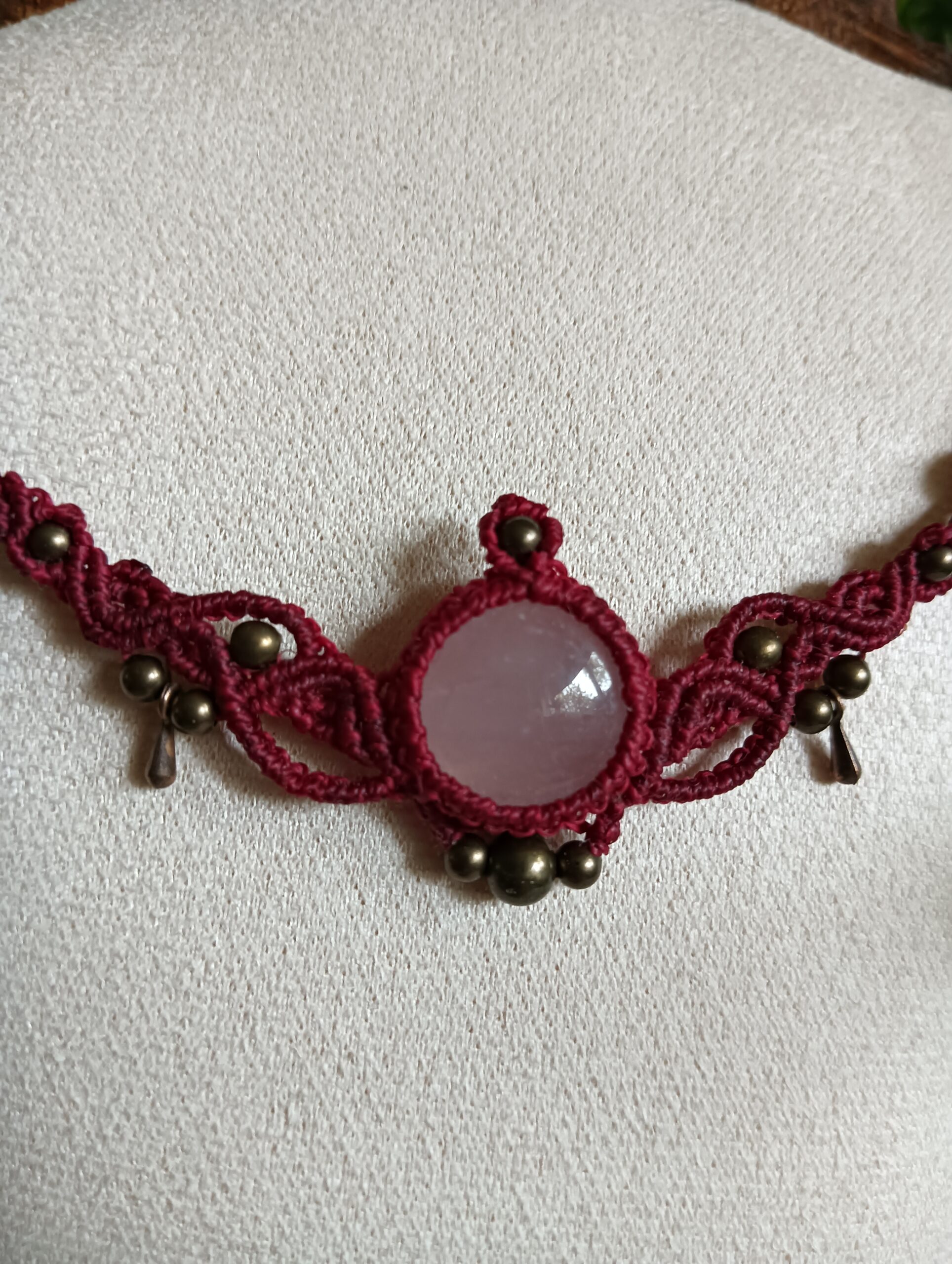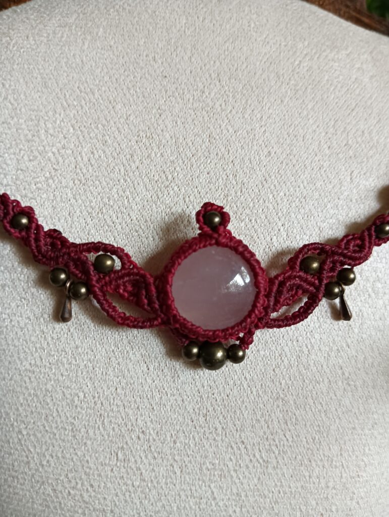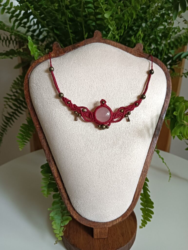Deze ketting, Elise, is één van mijn favoriete creaties. Ik heb haar met de hand geknoopt in een diepe bordeauxrode tint, die prachtig samenvalt met de zachte glans van de rozenkwarts cabochon in het midden. De steen straalt een rustige, liefdevolle energie uit – precies waar rozenkwarts om bekendstaat – en dat gevoel wilde ik in het hele ontwerp laten terugkomen.