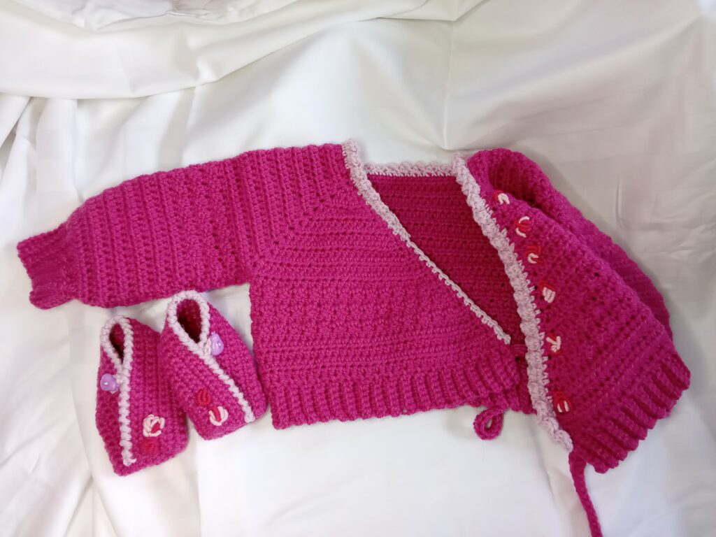 Voor een kindje van ongeveer 2 tot 6 maanden. De bloemetjes zijn hand geborduurd. De wikkel van de wol wordt bijgeleverd voor meer info. Bij iedere bestelling van 25.00 of meer ontvangt u een kleine verrassing gewoon omdat ik dat leuk vind.