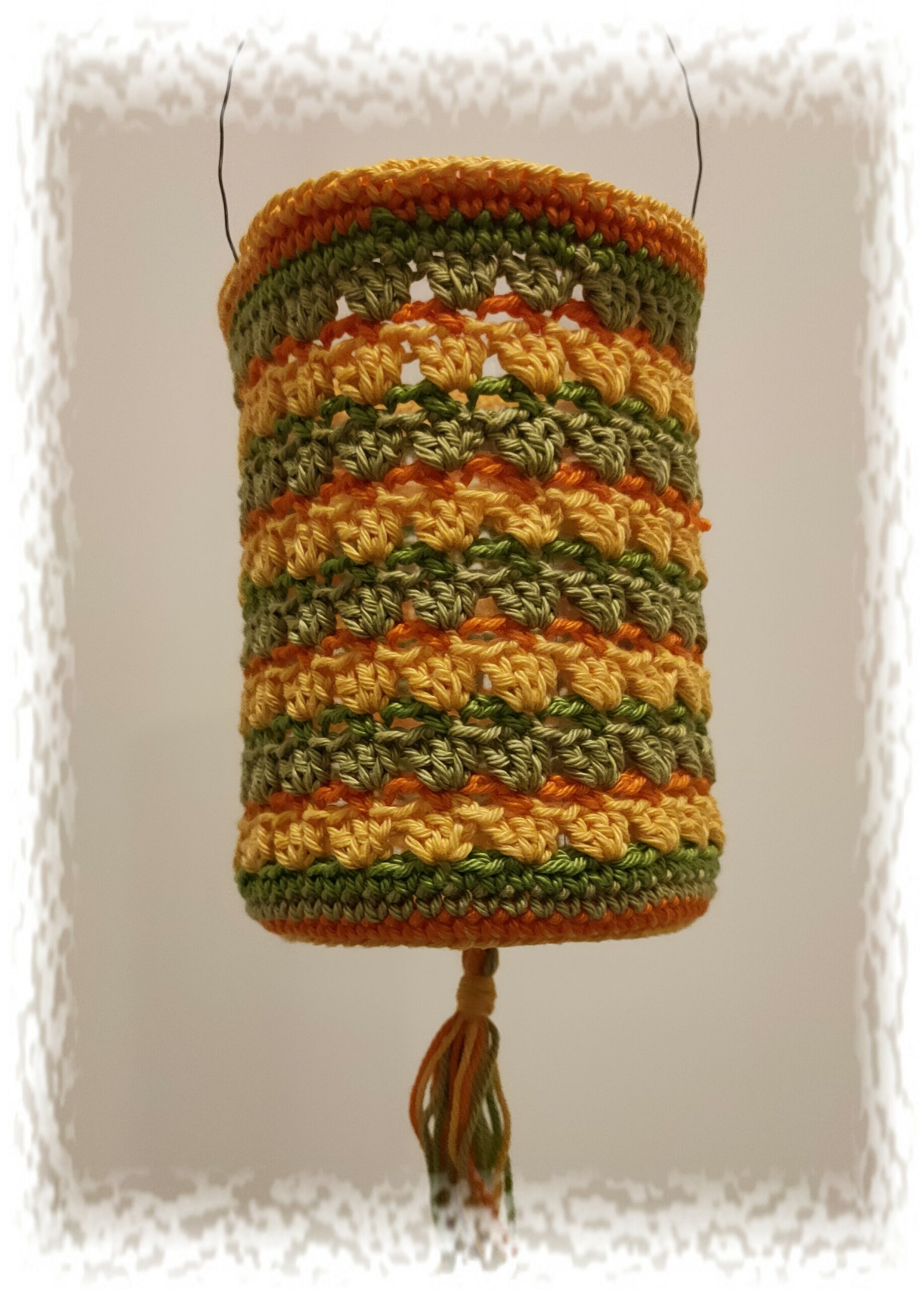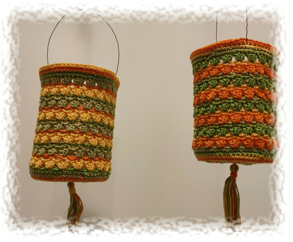 2 Gehaakte lampionnen in vrolijke kleuren.