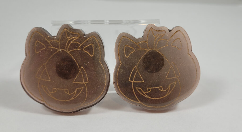 Wees voorbereid voor halloween met deze schattige kat pompoen magneten. De pompoenen zijn gemaakt van epoxy hars. Nadat de lijnen gevuld waren met goud kleurige acryl verf, hebben de magneten nog een beschermingslaag van epoxy hars gekregen.