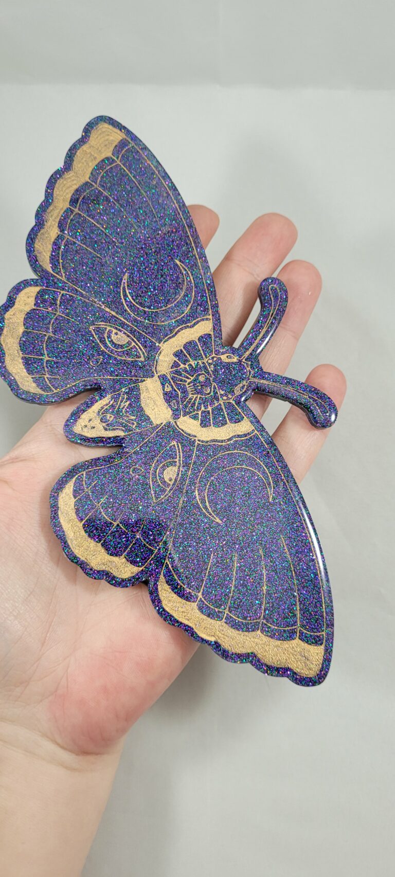 Prachtige unieke mot muur decoratie. De mot is gemaakt van epoxy hars met een glitters. Nadat de lijnen van de mot waren gevuld met gouden verf is de mot opnieuw bedekt met een laag hars om deze lijnen te beschermen.