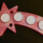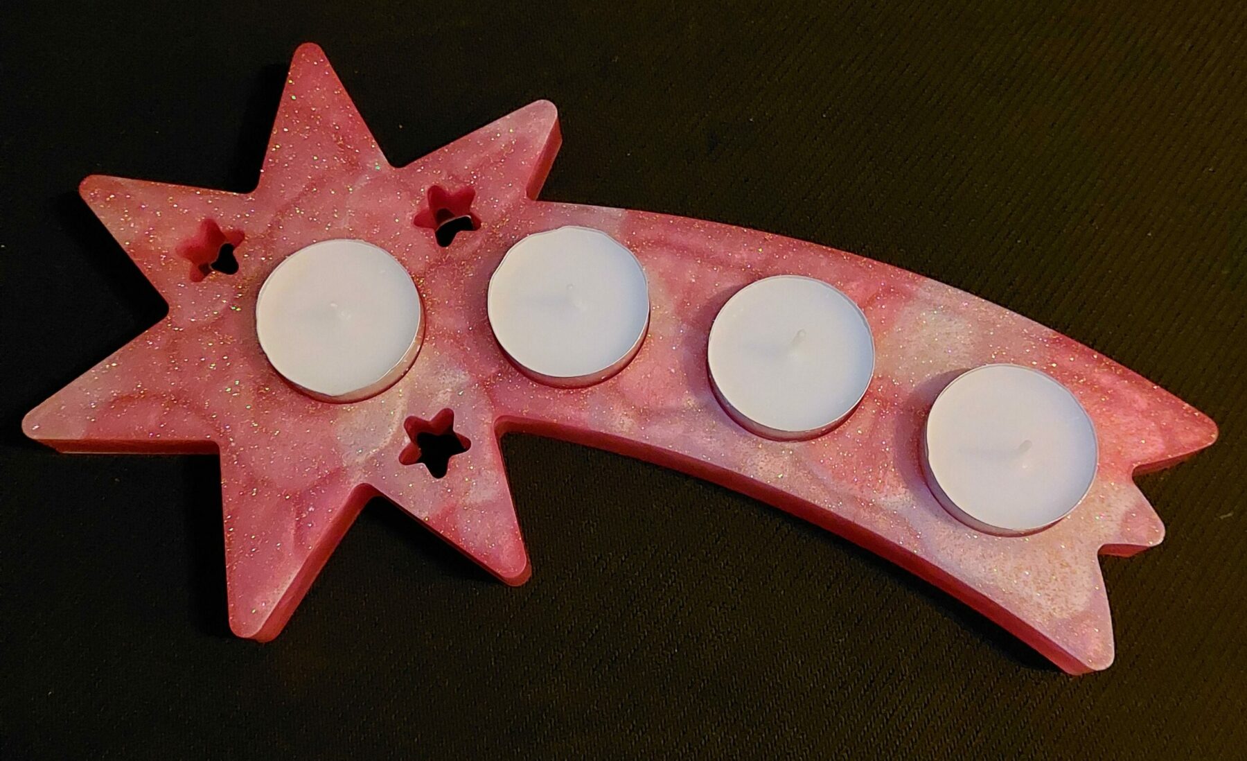 Deze mooie waxinelichtjes houder voor 4 waxinelichtjes is gemaakt van epoxy hars in combinatie met mica poeder en glitter in goudkleur.