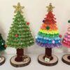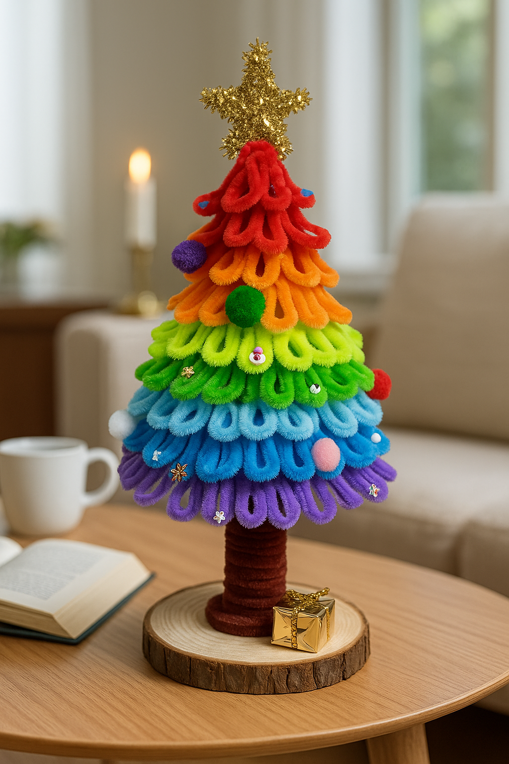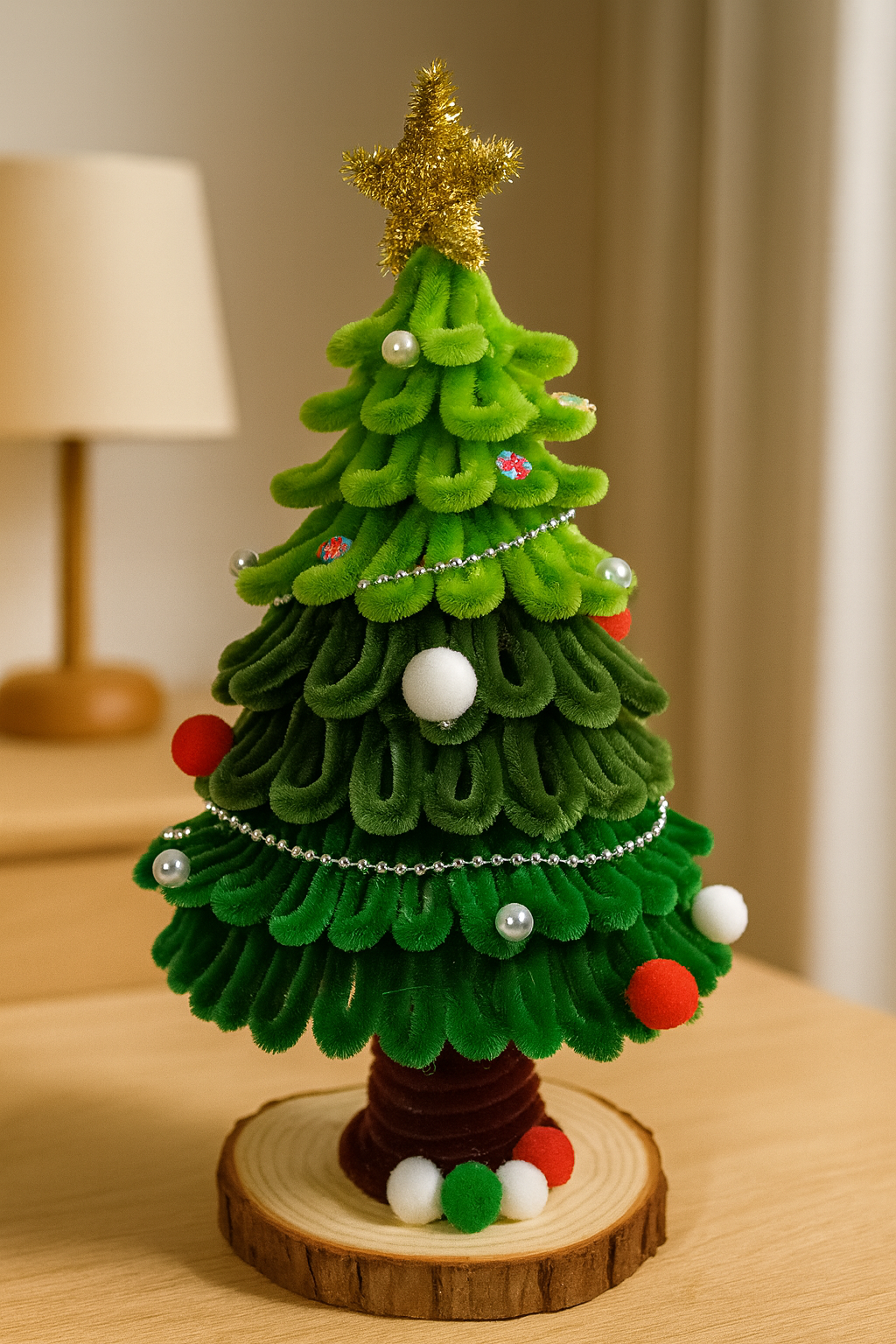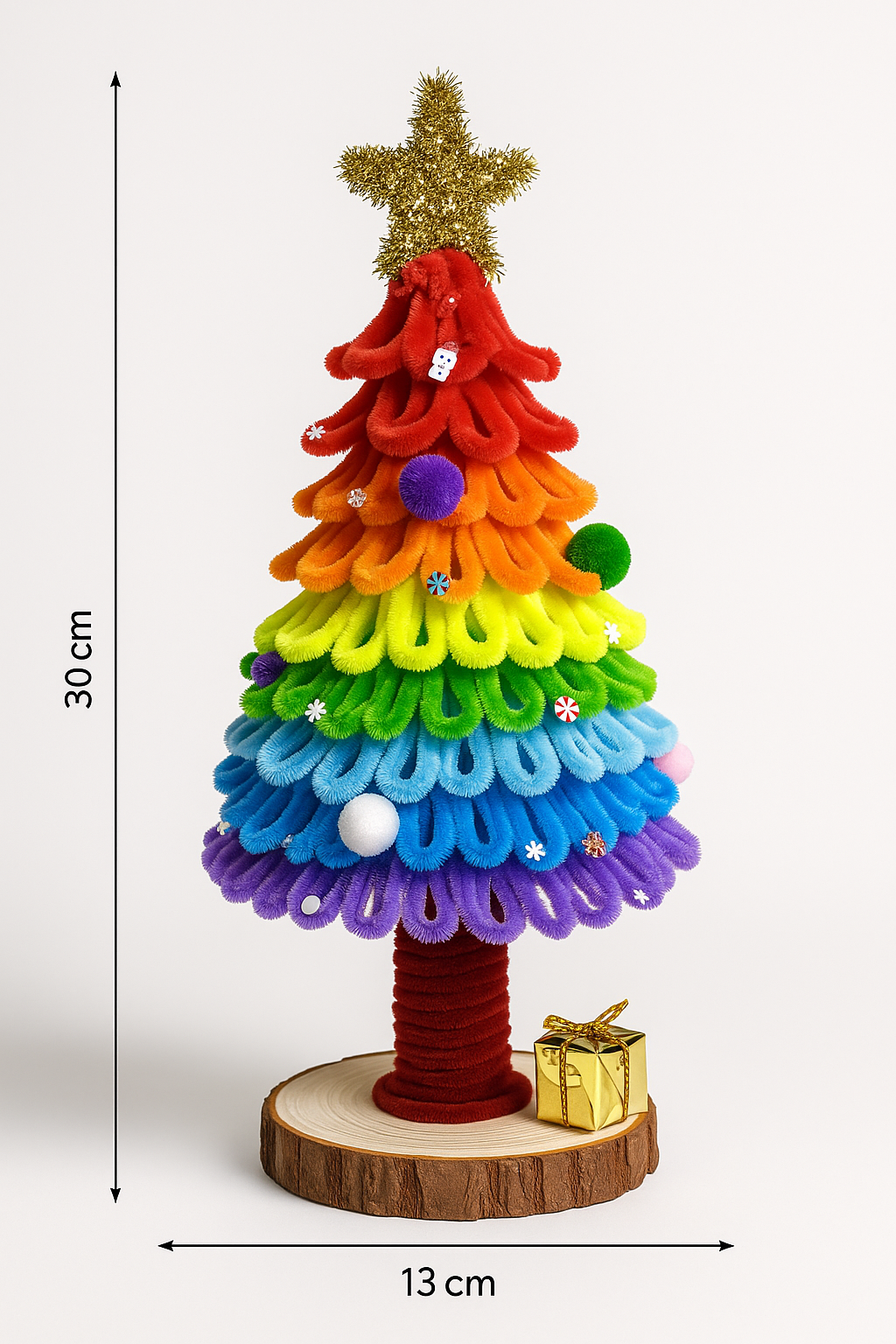 Deze handgemaakte kerstboom is zorgvuldig gemaakt van zacht chenilledraad, met een houten voet en gouden ster.
