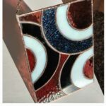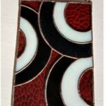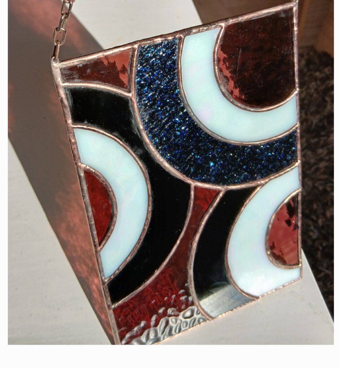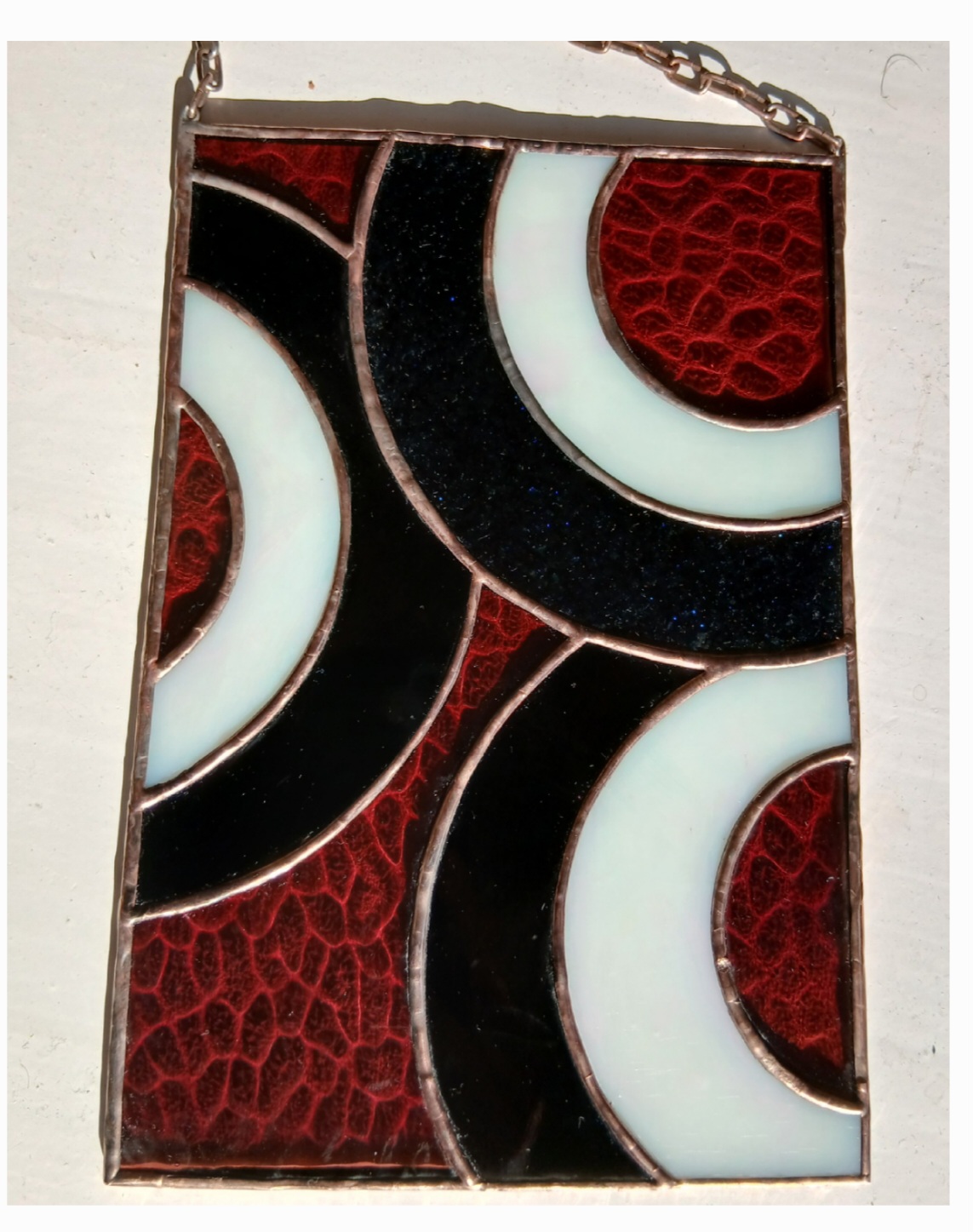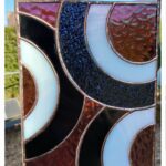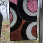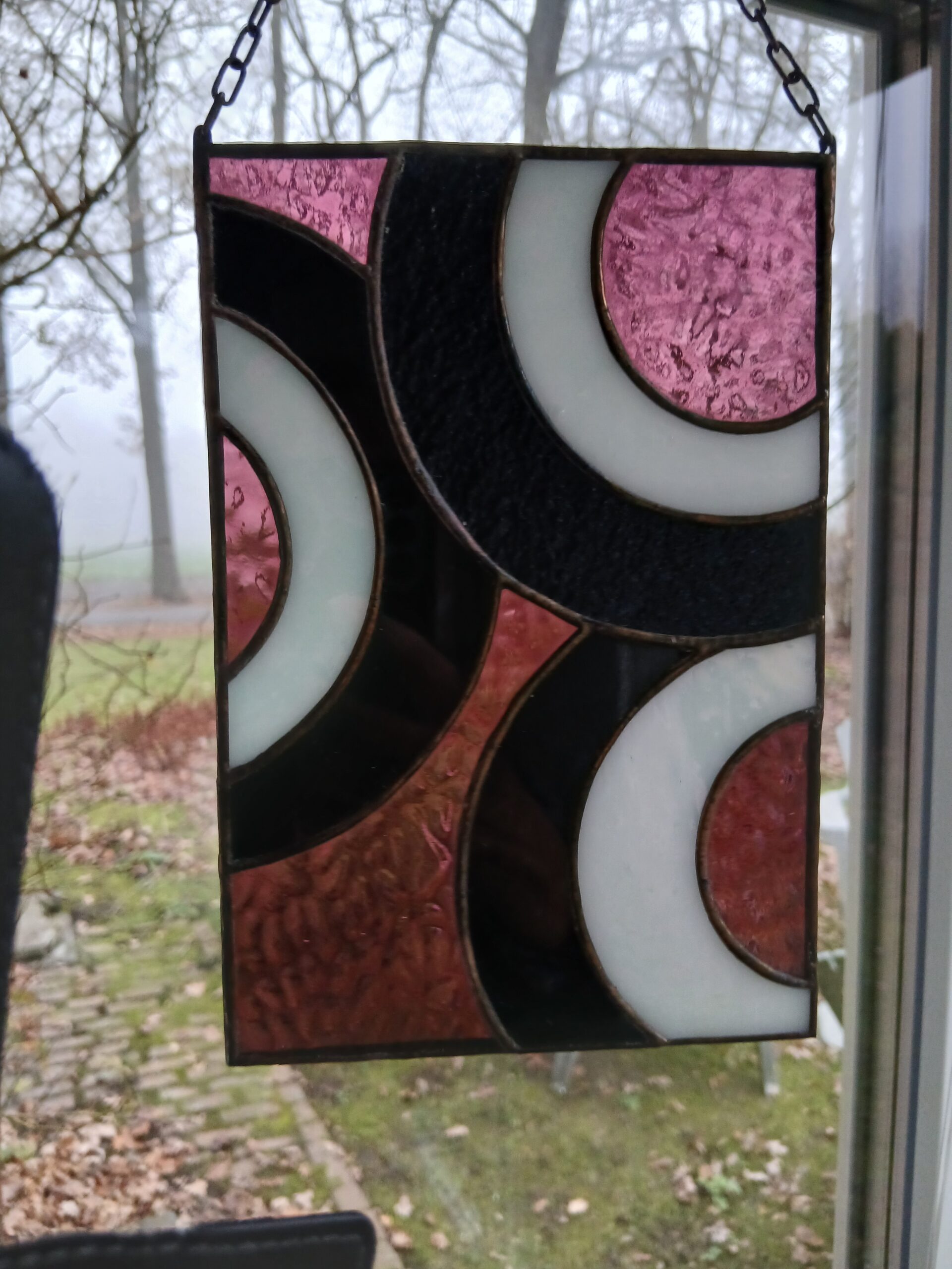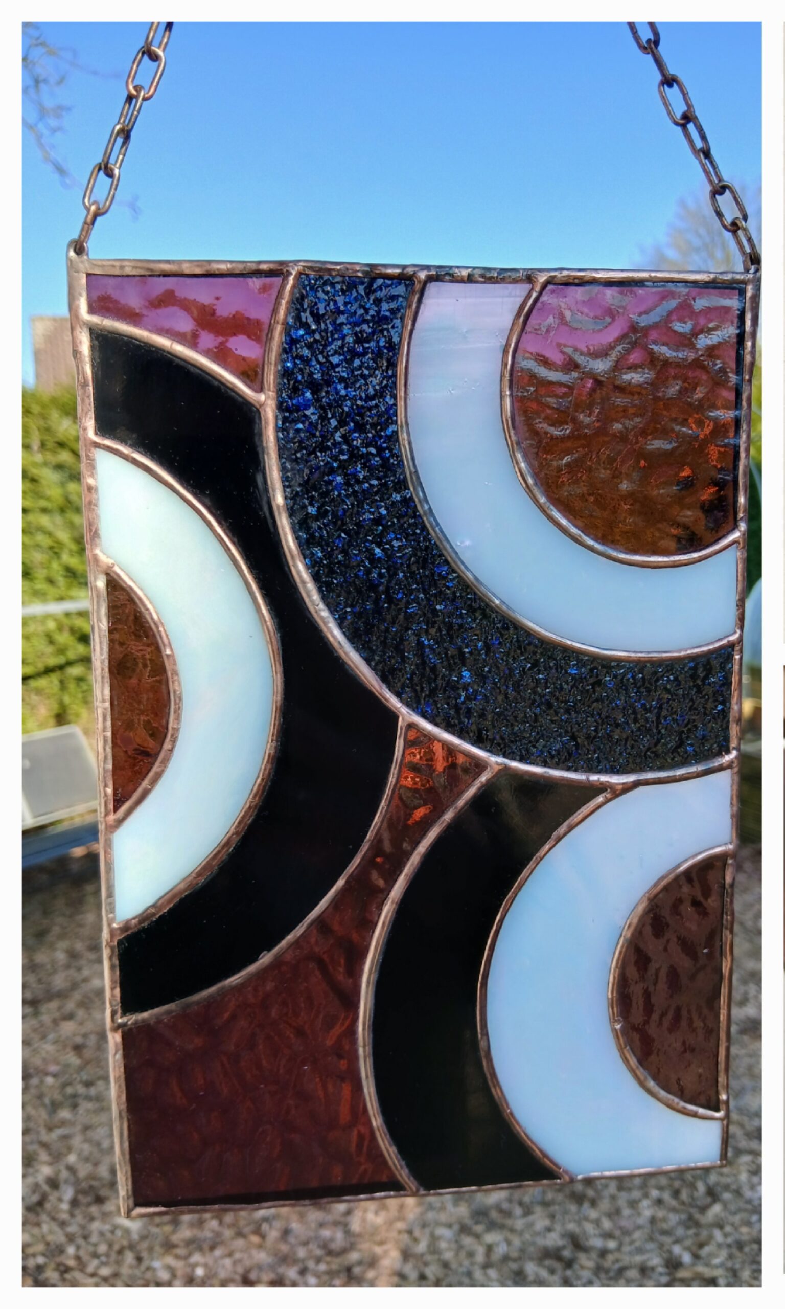 De stukken glas zijn door mij gesneden, geslepen, ingepakt in koperfolie en gesoldeerd. Vervolgens is het geheel gepatineerd waardoor de tin lijnen zwart geworden zijn. Dit geeft het geheel een glas in lood effect. De raamhanger is 14.5 bij 21 cm en met de ketting erbij 32 cm.